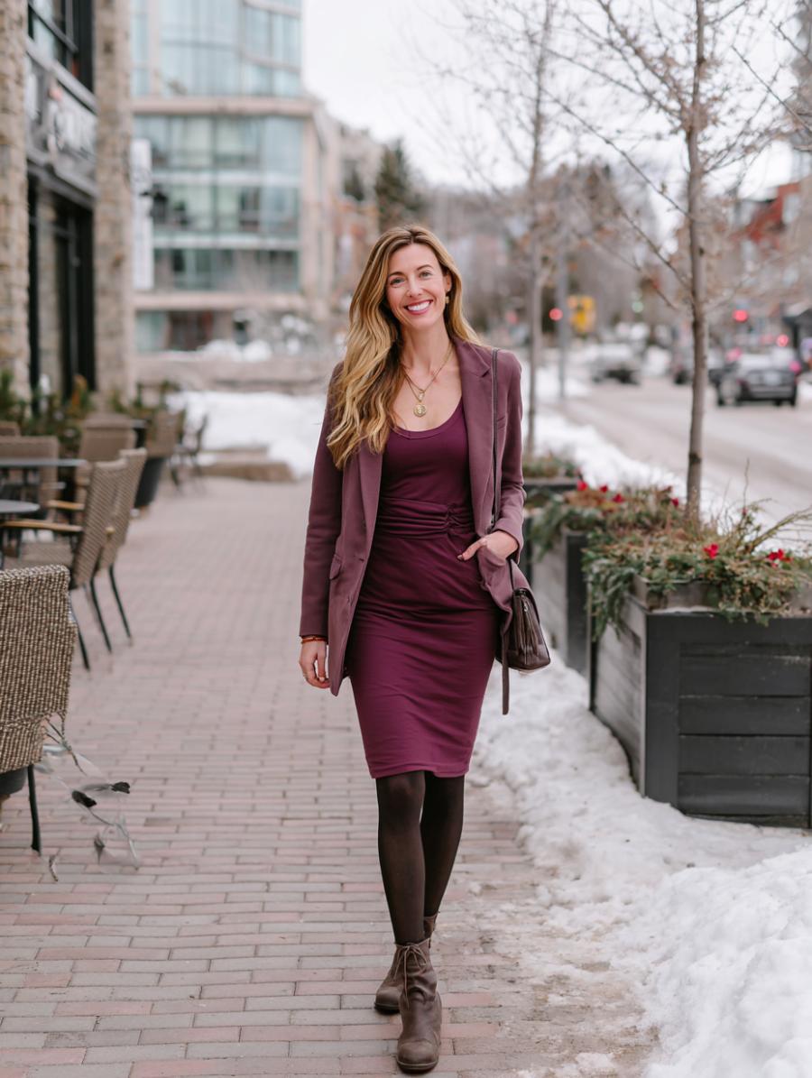 Burgundy creates instant sophistication when you match your fitted midi dress to a tailored blazer in complementary tones. Dark stockings elongate legs while adding warmth for winter styling. Brown suede ankle boots ground the monochromatic palette with earthy contrast. Delicate gold layered necklaces peek from the neckline, adding subtle sparkle without overwhelming the rich wine hues.