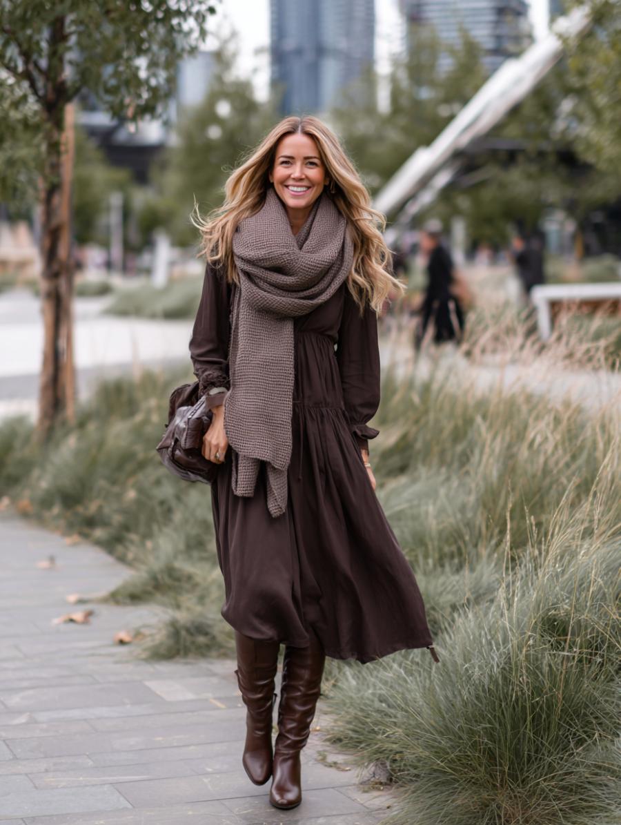 Monochromatic brown dressing creates an unbroken vertical line that instantly elongates your silhouette. The flowing midi dress moves beautifully while the oversized scarf adds texture without bulk. Knee-high boots extend the leg line, and the lightweight fabric drapes rather than clings. Rich chocolate tones feel sophisticated and seasonally appropriate while the layered textures prevent the single-color palette from appearing flat or boring.