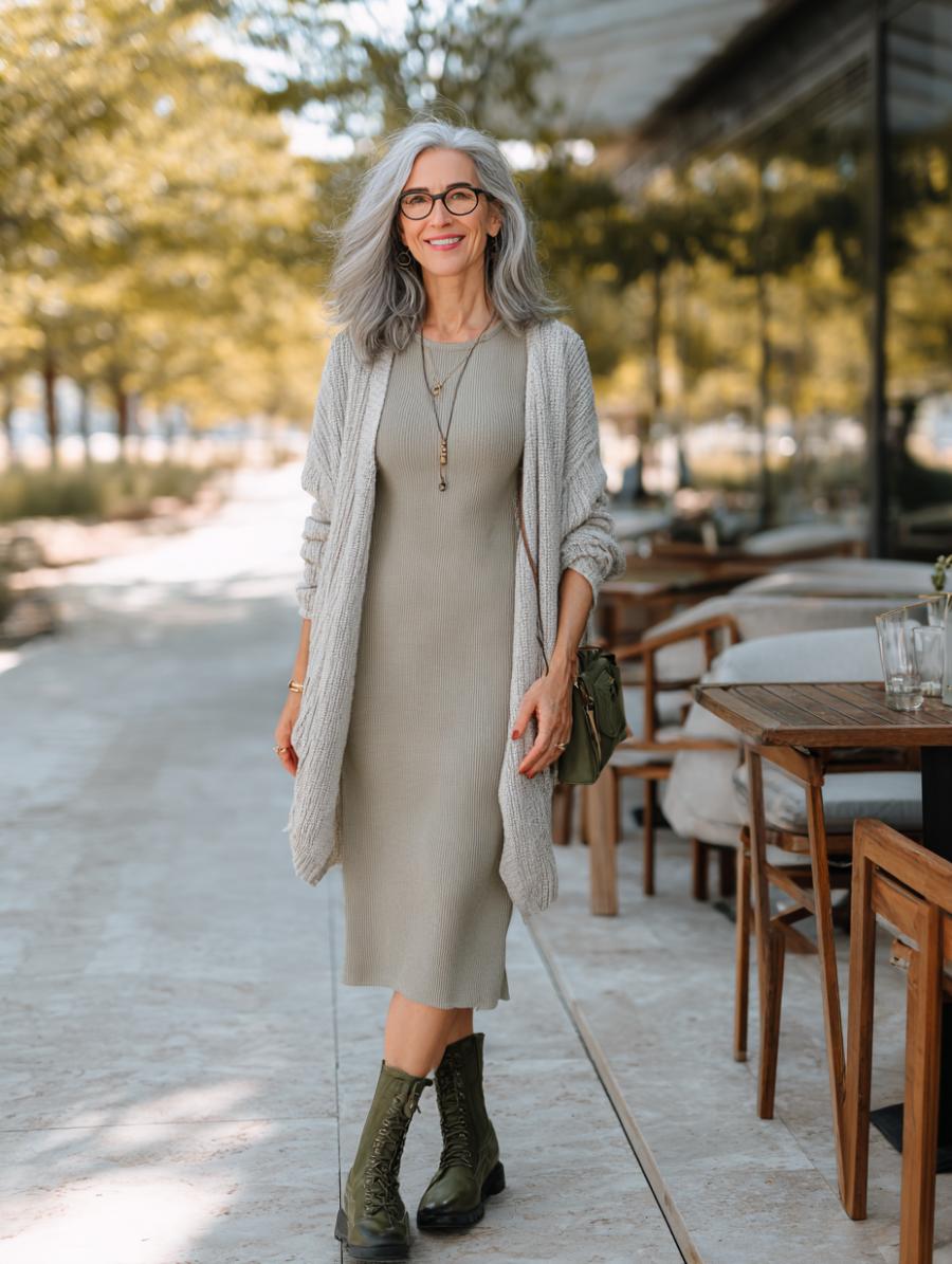 Sage green creates an effortlessly sophisticated palette that flatters every skin tone while maintaining an air of understated elegance. Layer a chunky knit cardigan over your ribbed midi dress for instant texture contrast that skims your silhouette beautifully. Combat boots inject unexpected edge into this refined look, proving that comfortable footwear can elevate rather than detract from polished style.