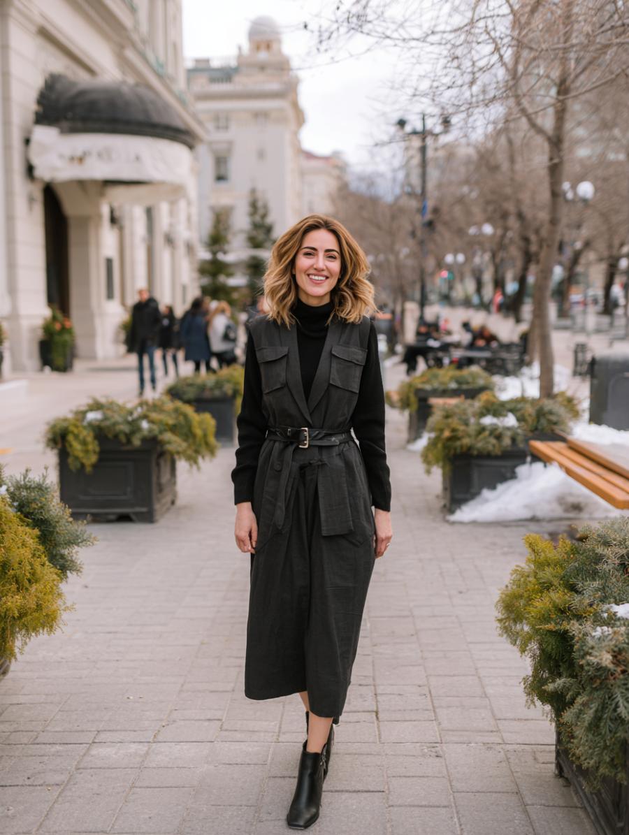 Gray ribbed turtleneck sweaters paired with sleeveless midi vests create vertical lines that elongate your silhouette beautifully. Belt the vest at your natural waist to define your shape while keeping the overall look polished and sophisticated. Black ankle boots add height and structure, while the neutral color palette ensures you’ll never look overdressed or frumpy for any occasion.