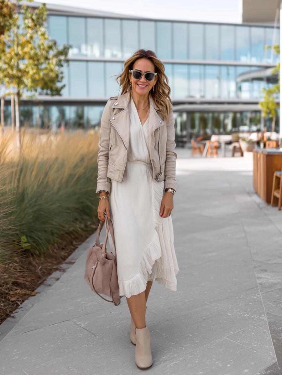 Beige suede transforms any flowing midi dress into an instantly elevated ensemble that flatters every figure. Layer your softest white midi over nude ankle boots for seamless leg-lengthening magic. Gold jewelry adds just enough sparkle while the structured moto jacket creates definition at your natural waist. Carry a coordinating handbag to tie the whole neutral palette together perfectly.