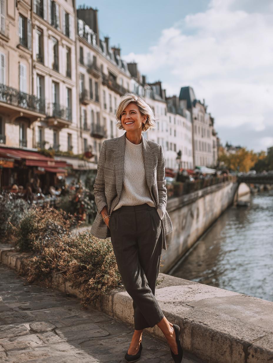 Gray cashmere sweaters paired with crisp white tailored trousers create an understated foundation that never fails. Layer on a black and white houndstooth blazer for instant Parisian polish, then ground the look with cognac leather loafers. This refined combination works beautifully for gallery openings, lunch meetings, or leisurely strolls through historic neighborhoods where timeless elegance always wins.