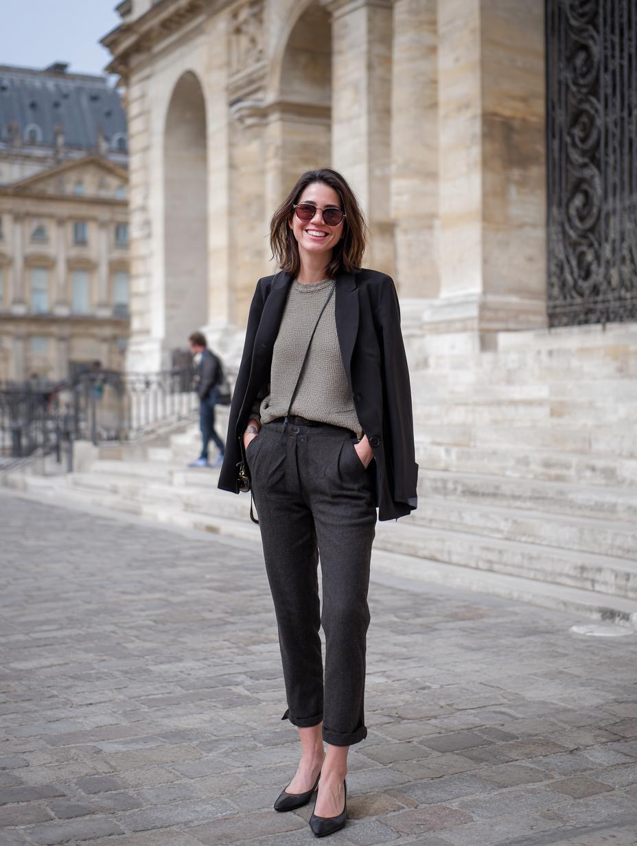 Charcoal wool tailored trousers anchor this refined ensemble with their perfectly cuffed hems and relaxed fit. The oversized black blazer drapes beautifully over a textured olive knit sweater, creating sophisticated layers that photograph beautifully against Parisian architecture. Black pointed-toe pumps elongate the silhouette while aviator sunglasses add modern edge to this timeless combination.