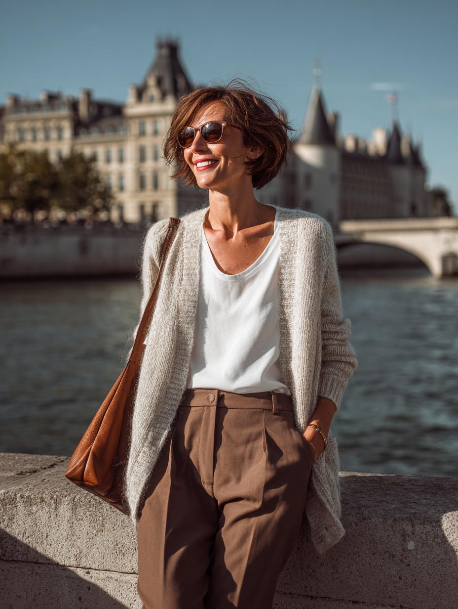 Camel wide-leg trousers paired with a crisp white tee create the foundation for sophisticated Parisian dressing. Layer an oversized cream cardigan for texture contrast while maintaining the neutral palette. Tortoiseshell sunglasses add instant polish, and a structured leather tote completes this riverside-ready ensemble that transitions seamlessly from morning café visits to afternoon museum strolls.
