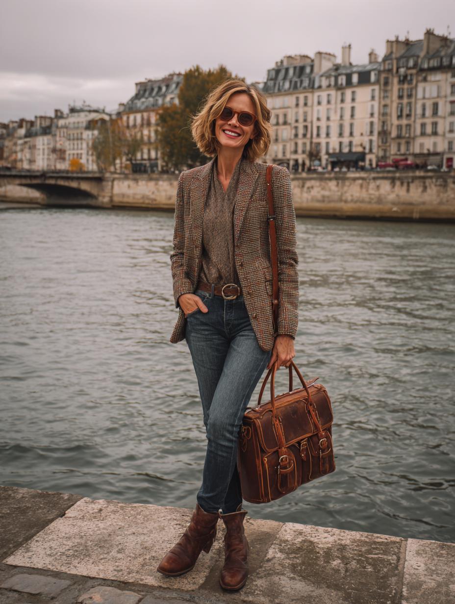Classic blue denim pairs beautifully with a structured tweed blazer for sophisticated Parisian appeal. Brown leather accessories add warmth and luxury to this refined casual ensemble. The tailored jacket elevates simple jeans into chic daywear perfect for strolling along the Seine or meeting friends for afternoon café visits.
