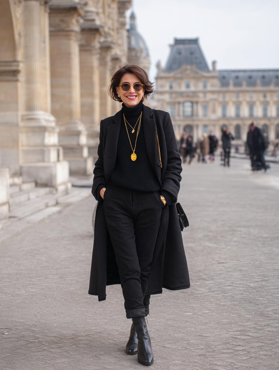 Monochromatic black creates instant sophistication when you layer a ribbed turtleneck sweater beneath a tailored wool coat. Gold pendant necklaces in varying lengths add luxurious dimension against the dark palette. Straight-leg trousers and leather ankle boots complete this effortlessly chic ensemble. Round sunglasses provide that essential Parisian mystique while maintaining the sleek, coordinated aesthetic that defines timeless French style.