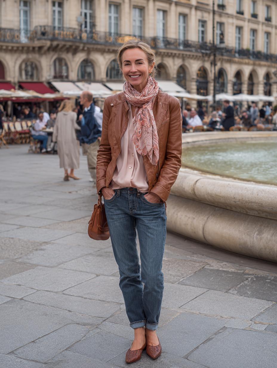 Cognac leather elevates casual denim into sophisticated territory when styled with deliberate intention. Rolling cuffs on boyfriend jeans creates visual interest while the dusty rose scarf adds feminine softness against structured leather. Low-heeled loafers ground the look with comfort and polish, proving that Parisian elegance thrives on mixing textures and tones rather than following rigid formulas.