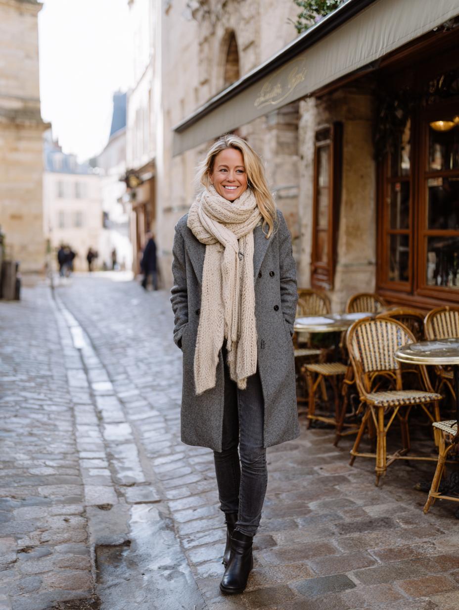 Charcoal wool coats paired with chunky cream scarves create sophisticated winter sophistication. The oversized silhouette flatters every figure while maintaining polished appeal. Dark denim and sleek boots ground the look with modern practicality. Neutral tones blend seamlessly, allowing texture contrasts between smooth wool and cable-knit accessories to shine. Perfect for leisurely strolls through cobblestone districts.