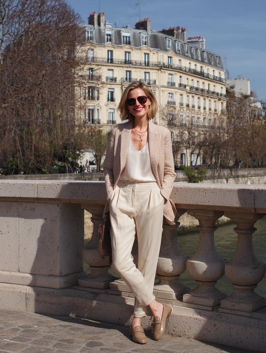 Cream linen separates create the perfect foundation for sophisticated Parisian styling. The tailored blazer paired with high-waisted trousers delivers polished elegance while maintaining breathable comfort for warm city days. Gold layered necklaces add luxurious detail, while classic loafers ground the ensemble with timeless appeal. Aviator sunglasses complete this refined look that transitions seamlessly from riverside strolls to business lunches with unmistakable French sophistication.