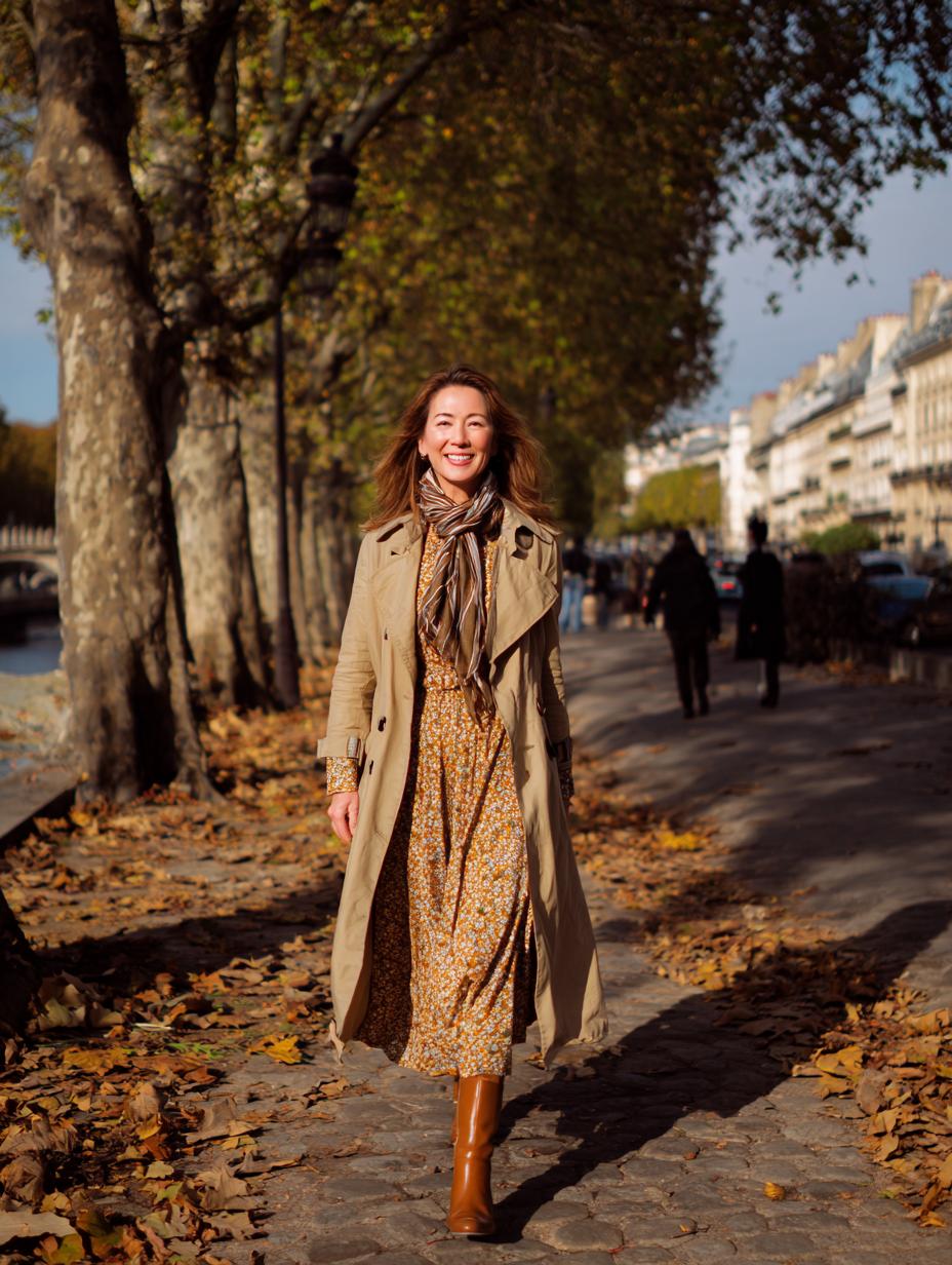 Camel trench coats remain the ultimate investment piece for sophisticated women. Layer yours over feminine floral midi dresses to create stunning contrast between structured outerwear and romantic prints. Cognac leather boots ground the look while adding rich texture, and the striped scarf introduces subtle pattern play. This effortless combination transitions beautifully from morning coffee dates to evening cultural events, proving that classic pieces never lose their appeal.