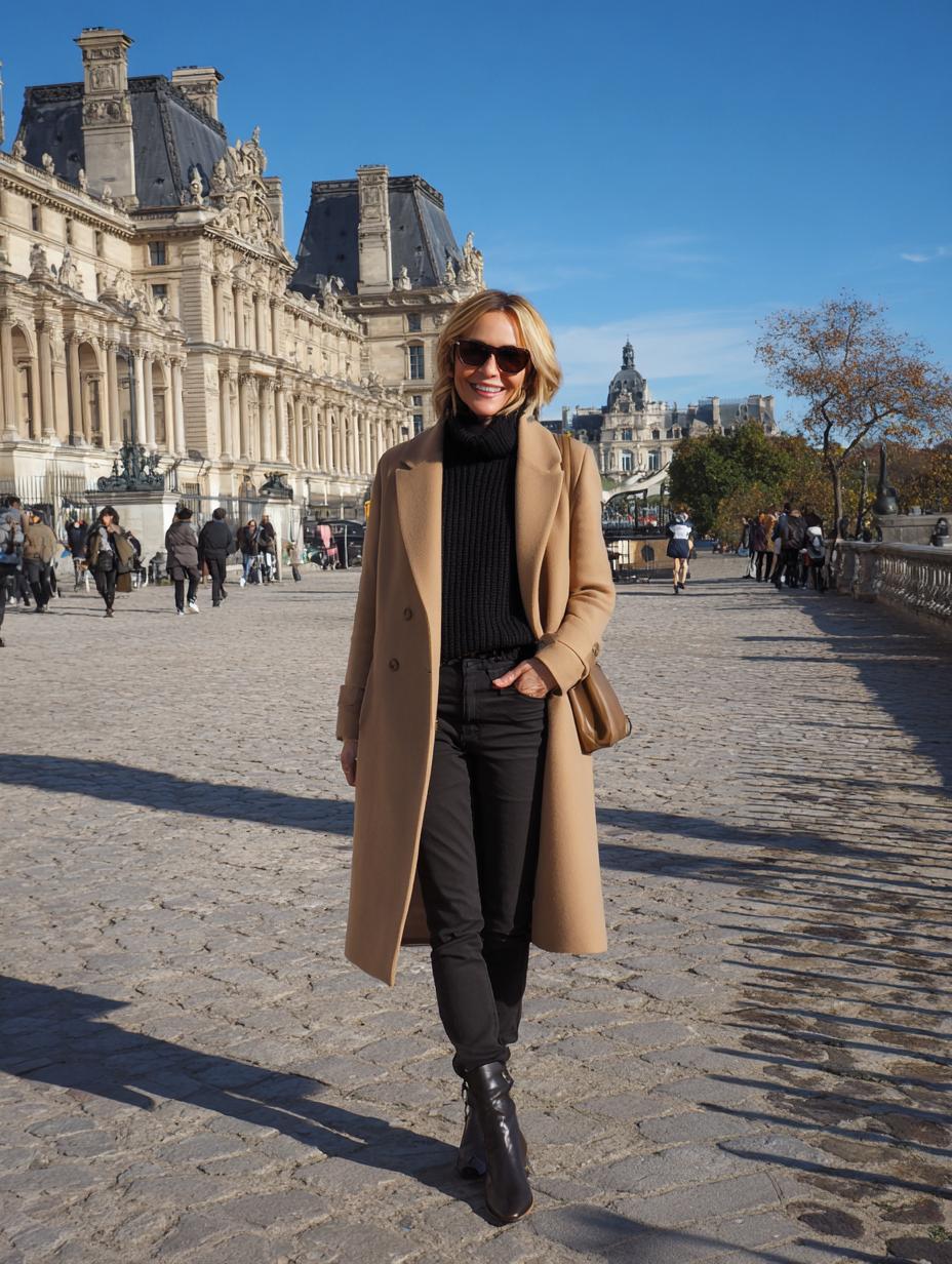 Camel wool coats reign supreme for sophisticated city strolling, especially when paired with dark denim and ribbed turtlenecks. Black leather ankle boots ground this timeless combination while designer sunglasses add mystery. The neutral palette works effortlessly against historic architecture, proving that classic pieces never lose their appeal. This polished approach to casual dressing embodies effortless Parisian style.