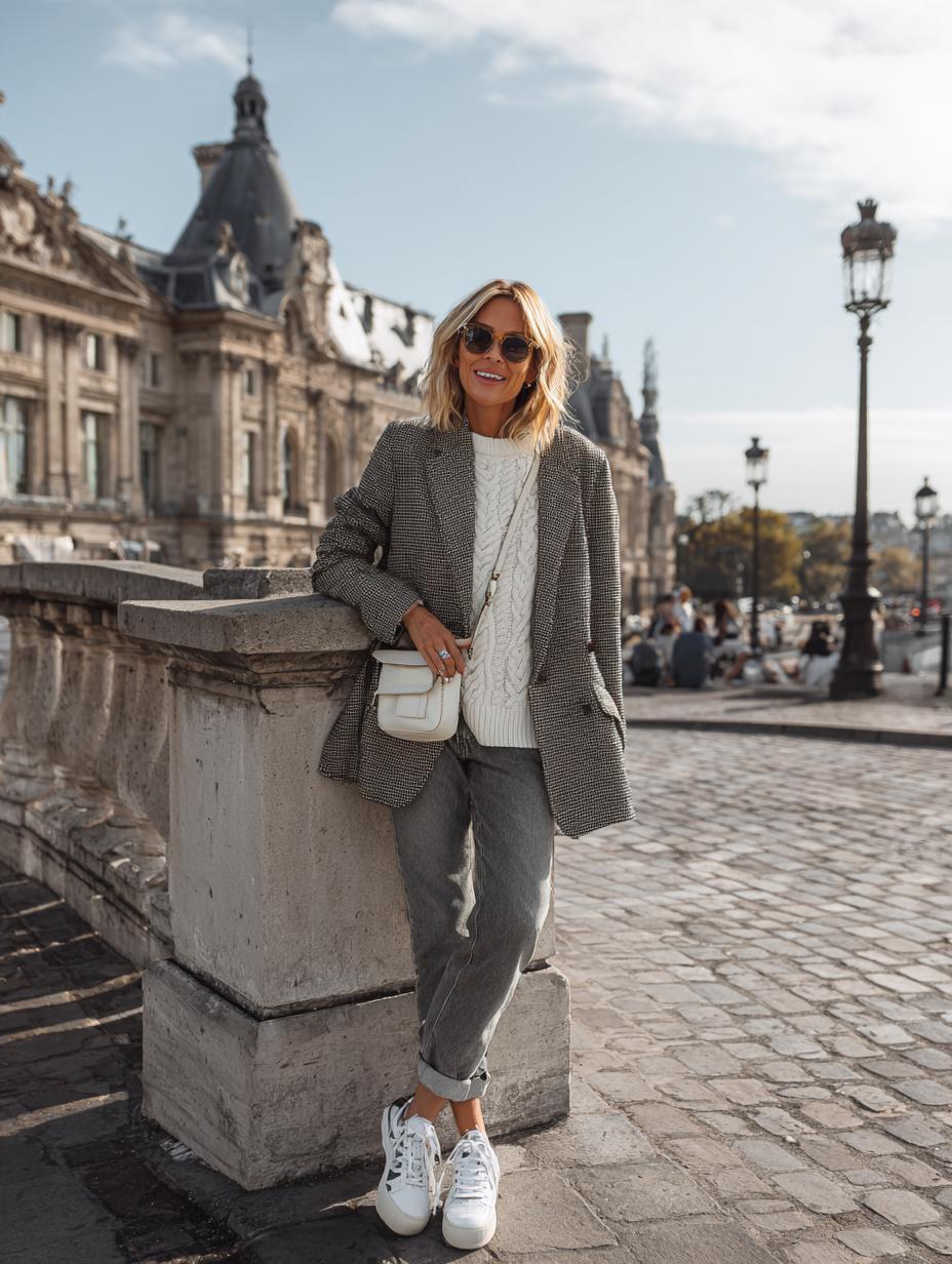 Gray houndstooth blazers transform simple weekend looks into effortlessly chic ensembles perfect for sophisticated women navigating city streets. Pair yours with cream cable-knit sweaters and relaxed denim for instant Parisian polish. White sneakers ground the outfit with modern comfort, while structured crossbody bags add practical elegance. Round sunglasses complete this masterful balance of tailored professionalism and casual confidence that works beautifully for gallery openings or leisurely café visits.