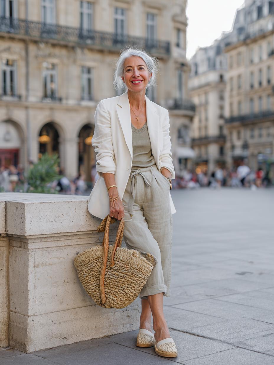 Silver hair pairs beautifully with this tonal neutral palette that screams understated elegance. The relaxed linen trousers feature a flattering high waist and comfortable drawstring, while the cream blazer adds structure without sacrificing comfort. Woven espadrilles and a natural straw tote complete this polished yet approachable look that works perfectly for weekend market strolls or casual lunch dates.