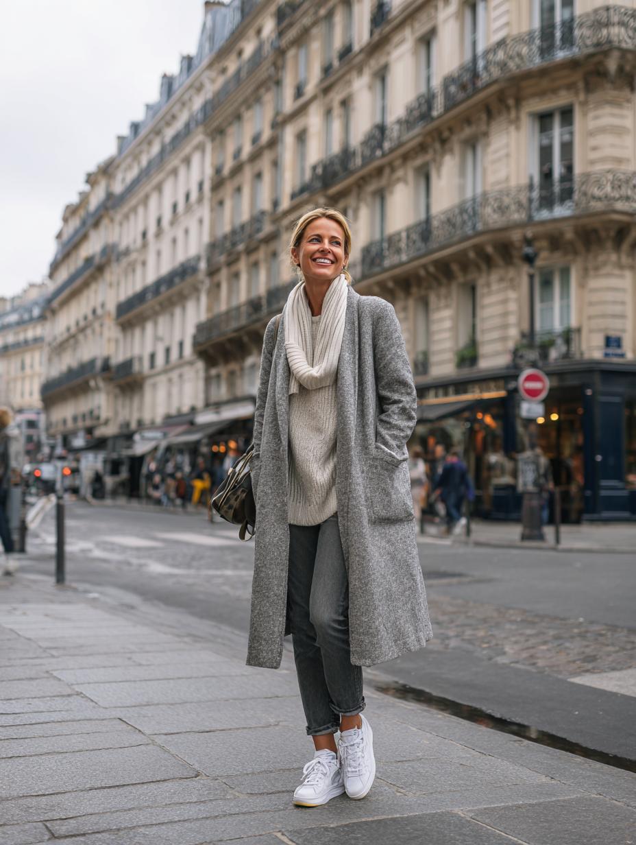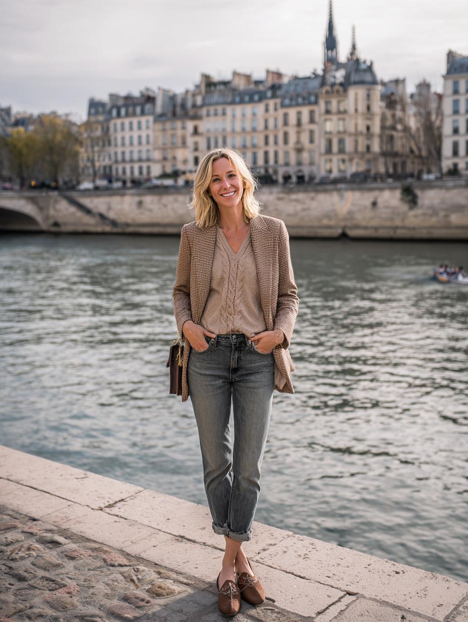 Cable-knit sweaters paired with tailored blazers create the perfect foundation for sophisticated riverside strolls. Gray denim adds modern ease while brown leather accessories ground the neutral palette beautifully. Roll your sleeves and cuffs for that effortlessly undone Parisian touch that looks intentional yet relaxed. Muted tones work harmoniously together, proving that understated elegance never goes out of style.