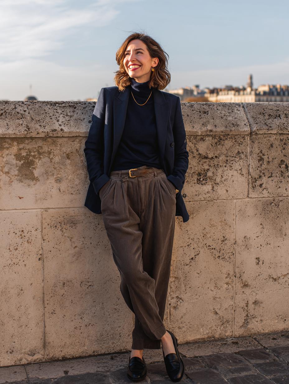 Navy wool blazer elevates relaxed brown corduroy trousers into pure Parisian elegance. The black turtleneck creates a sleek foundation while gold jewelry adds warmth against the neutral palette. Black leather loafers complete this refined yet comfortable look that transitions seamlessly from office meetings to evening strolls along the Seine.