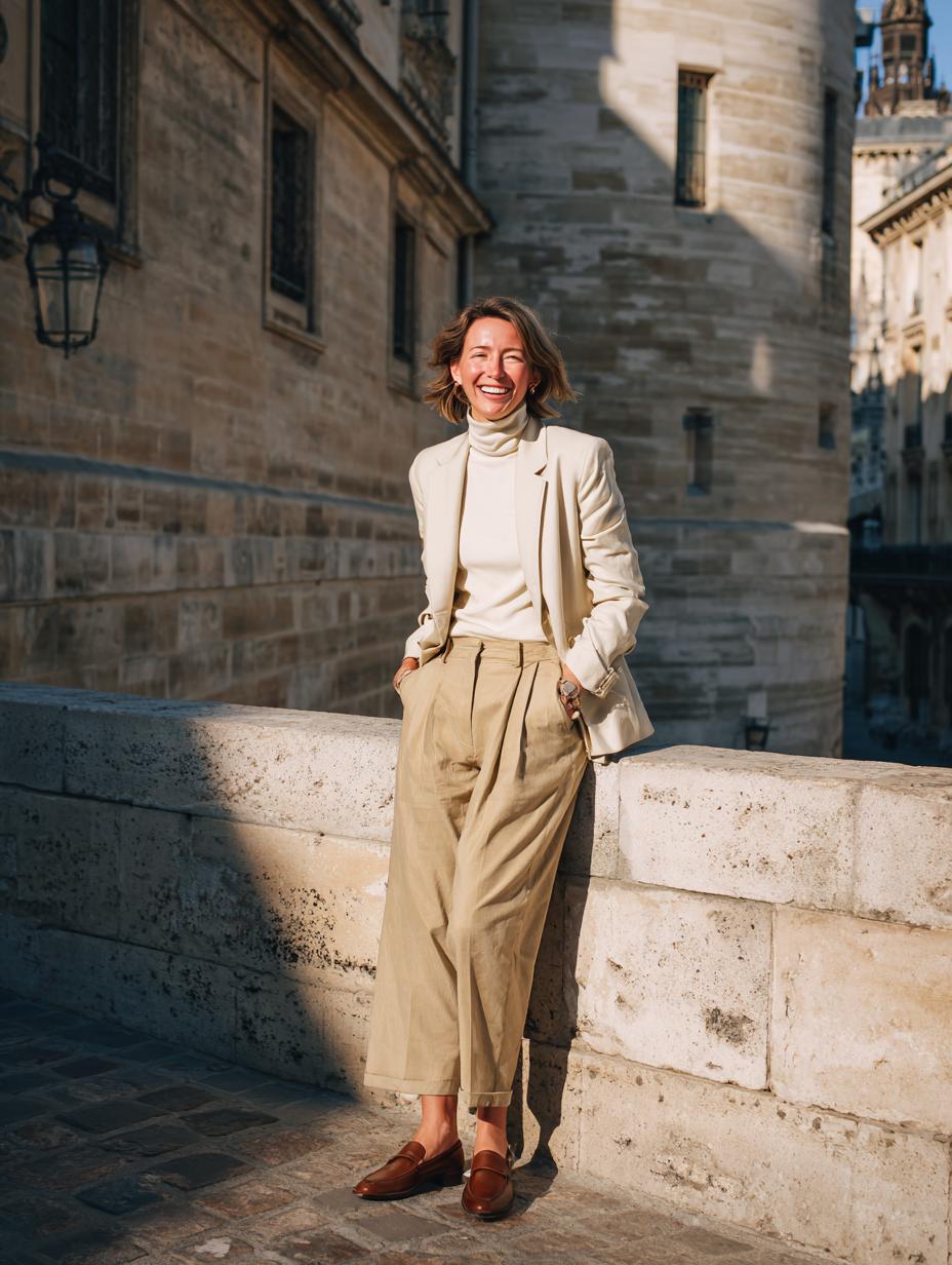 Cream cashmere turtleneck pairs beautifully with tailored beige blazer and wide-leg trousers for ultimate refinement. Rich cognac leather loafers ground the monochromatic palette while adding luxurious texture contrast. Rolling sleeves and relaxed silhouettes create approachable sophistication perfect for gallery openings, lunch meetings, or cultural excursions through historic city centers.