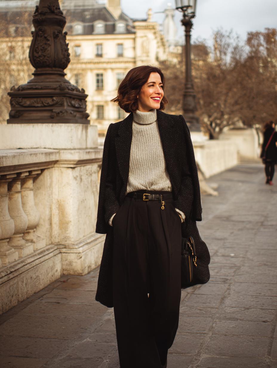 Cream ribbed turtleneck sweaters paired with charcoal wide-leg trousers create an understated foundation that speaks volumes about refined taste. Layer on a structured black wool coat and cinch everything with a cognac leather belt featuring gold hardware. Complete this monument-worthy look with a structured handbag and let the Parisian architecture serve as your backdrop while you embody timeless sophistication.