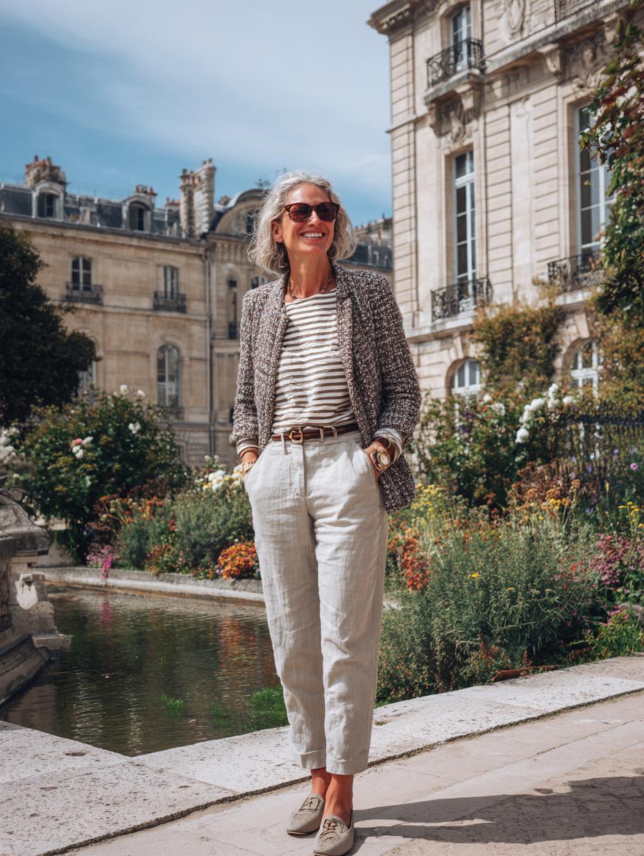 Tweed blazers paired with classic striped tops create effortless French sophistication that transcends seasons. Wide-leg linen trousers add modern comfort while maintaining elegant proportions. Brown leather accessories ground the neutral palette perfectly. Tortoiseshell sunglasses complete this timeless look that works beautifully for garden strolls, museum visits, or leisurely café afternoons in the city.