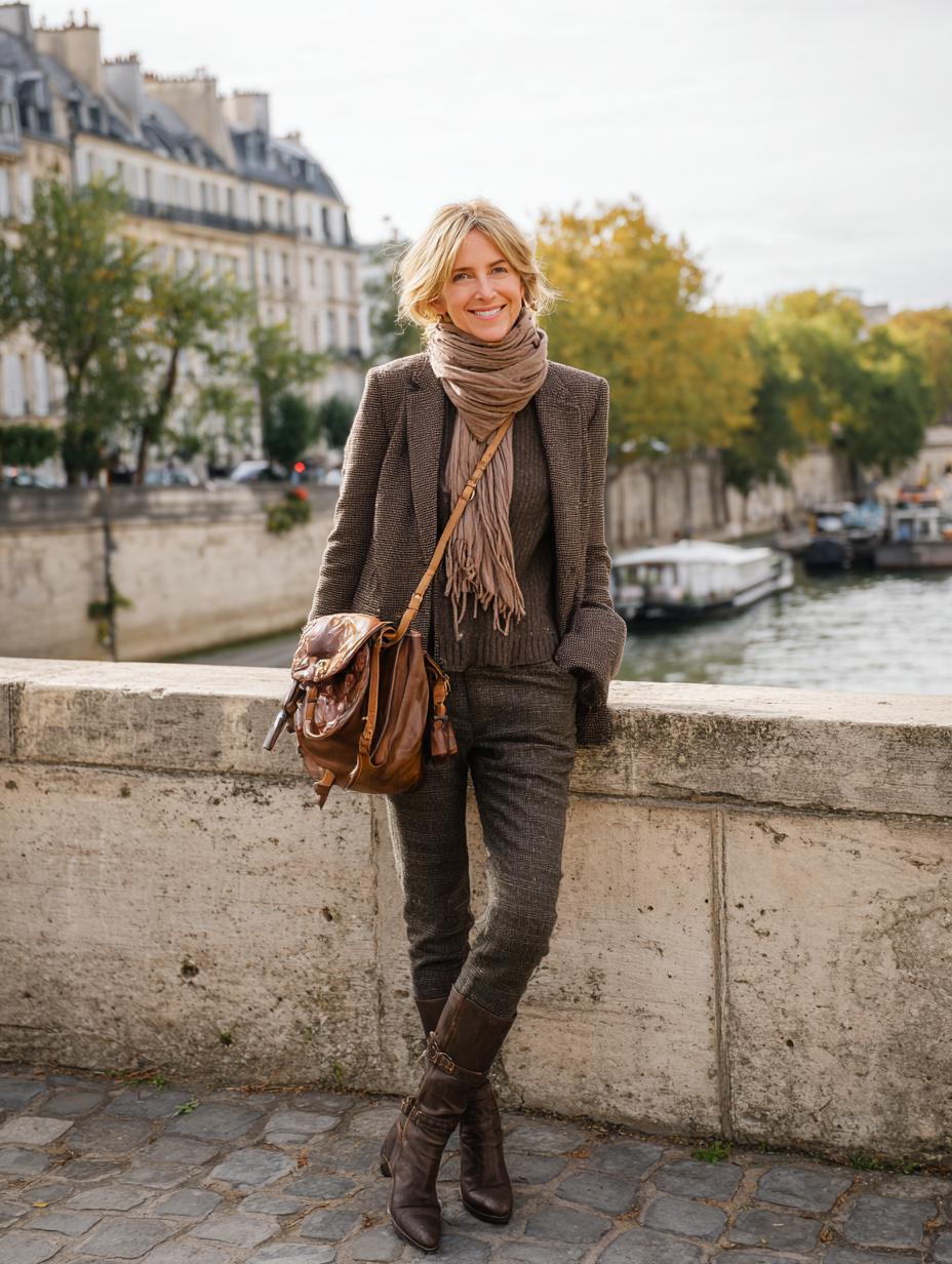 Brown tweed blazer and matching trousers create sophisticated autumn elegance along Parisian cobblestones. Wrap the coordinating fringed scarf loosely around your neck for textural interest that echoes the suit’s rich earth tones. Complete this polished look with cognac leather accessories and chocolate brown riding boots. The monochromatic palette exudes understated luxury while maintaining comfortable wearability for city strolling.