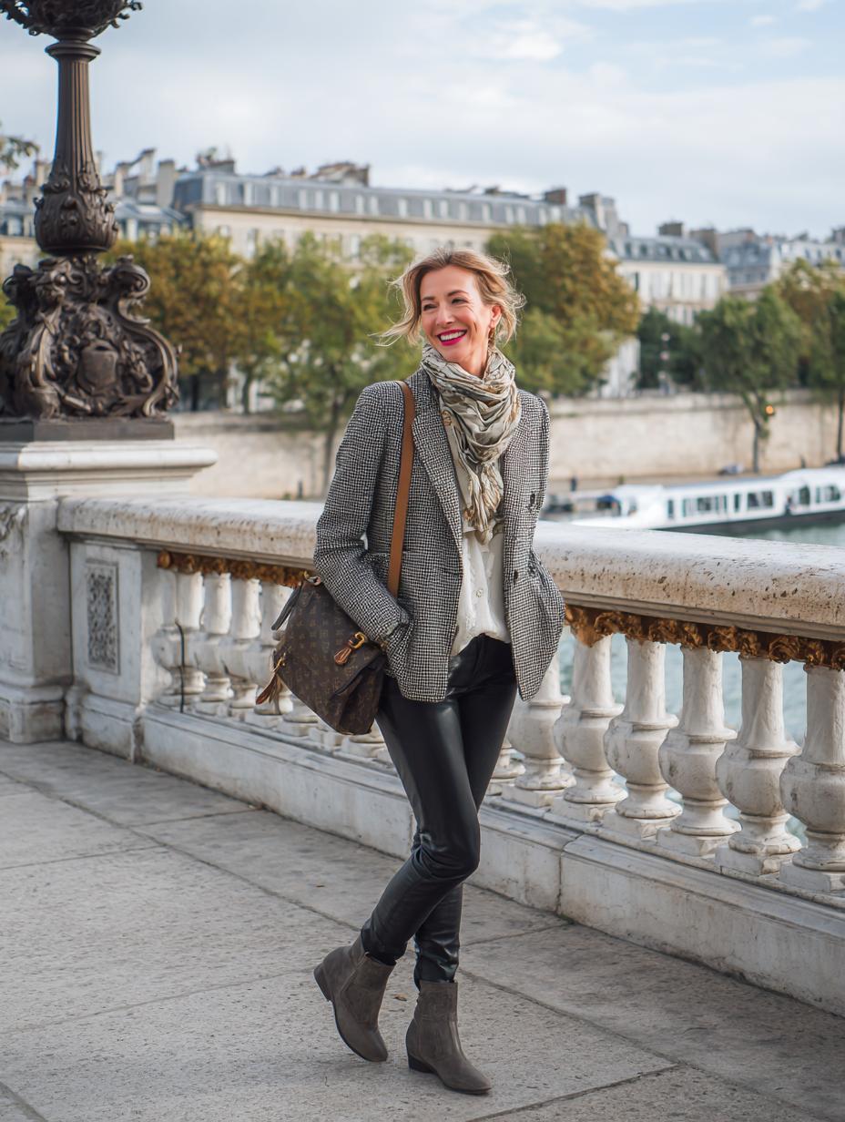Gray houndstooth blazer paired with sleek black leather pants creates sophisticated autumn elegance on Parisian streets. Neutral silk scarf adds textural interest while suede ankle boots ground the look with casual refinement. This polished ensemble transitions seamlessly from riverside strolls to intimate café meetings, proving that timeless pieces always outshine fleeting trends.