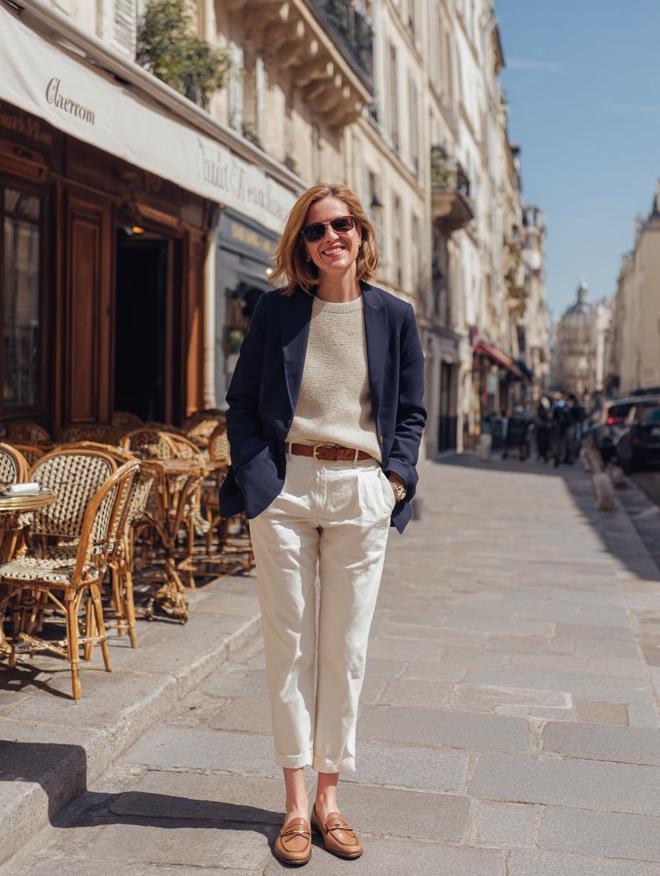 Navy blazer elegance transforms everyday neutrals into Parisian perfection. Cream linen trousers create flowing movement while the structured blazer adds instant sophistication. Brown leather accessories ground the palette beautifully. Rolled sleeves and relaxed tailoring prevent stuffiness, making this combination ideal for gallery openings, lunch meetings, or sophisticated shopping expeditions through Saint-Germain.