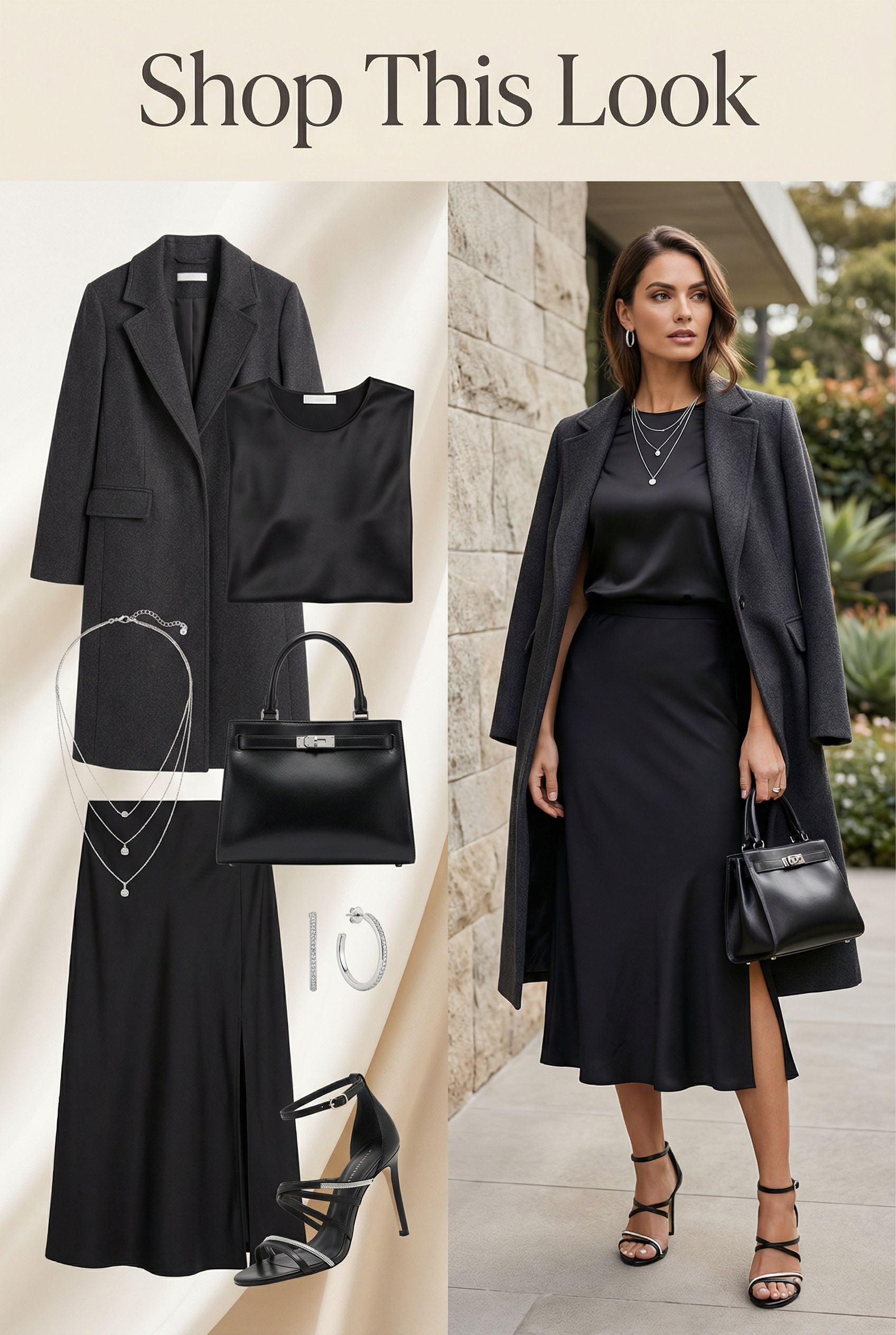 This timeless ensemble exudes understated glamour perfect for upscale dining. Pair a black crepe midi dress with a subtle V-neckline with a sharply tailored black blazer featuring satin lapels. Slip into classic black pointed-toe pumps with three-inch heels and carry a structured black leather clutch with gold hardware. Accessorize with medium-sized gold hoop earrings and a delicate gold chain bracelet. The monochrome palette creates an elongating effect while the strategic gold accents add warmth and sophistication to this fail-safe evening look. Scroll down to shop this look.