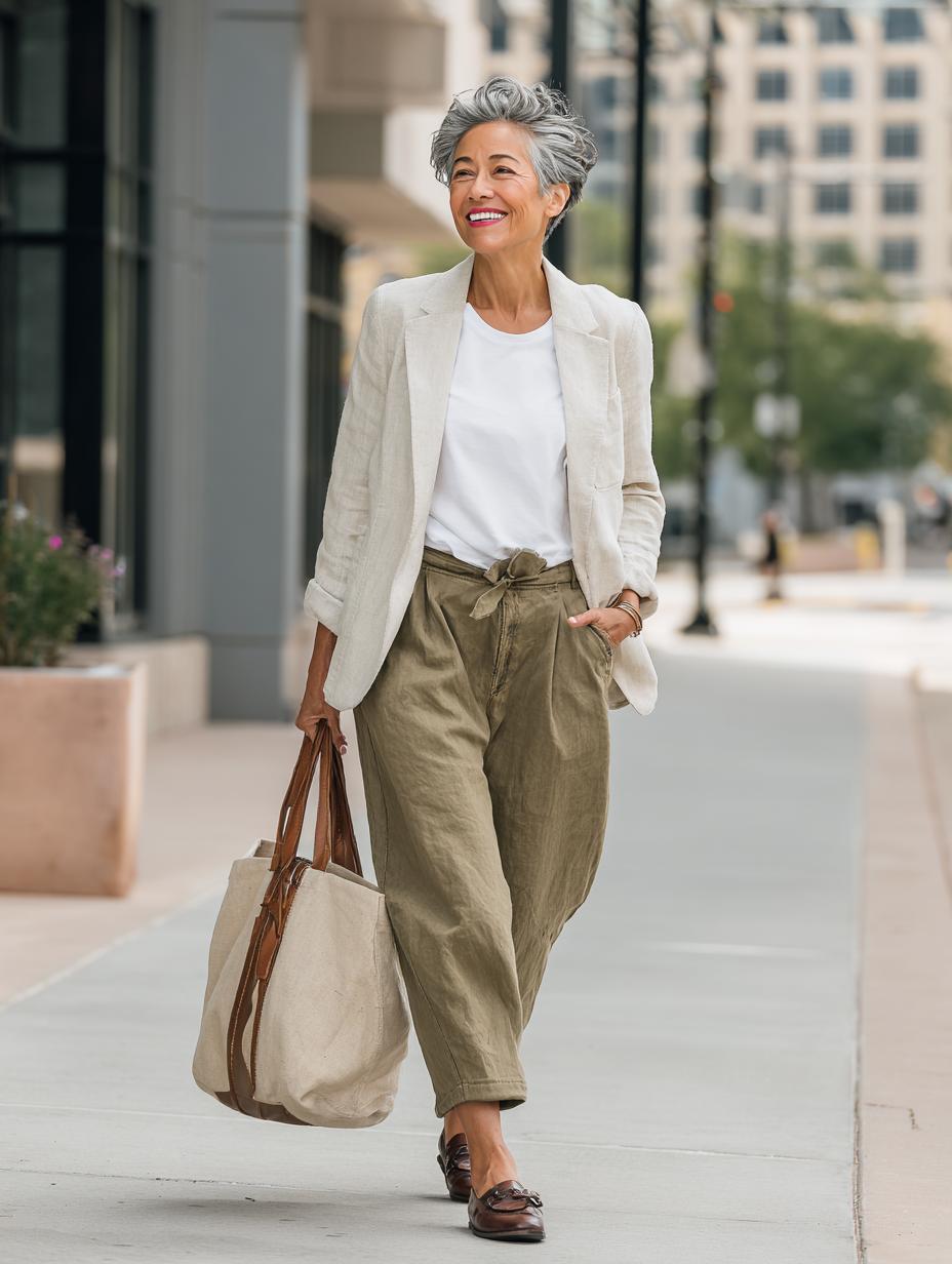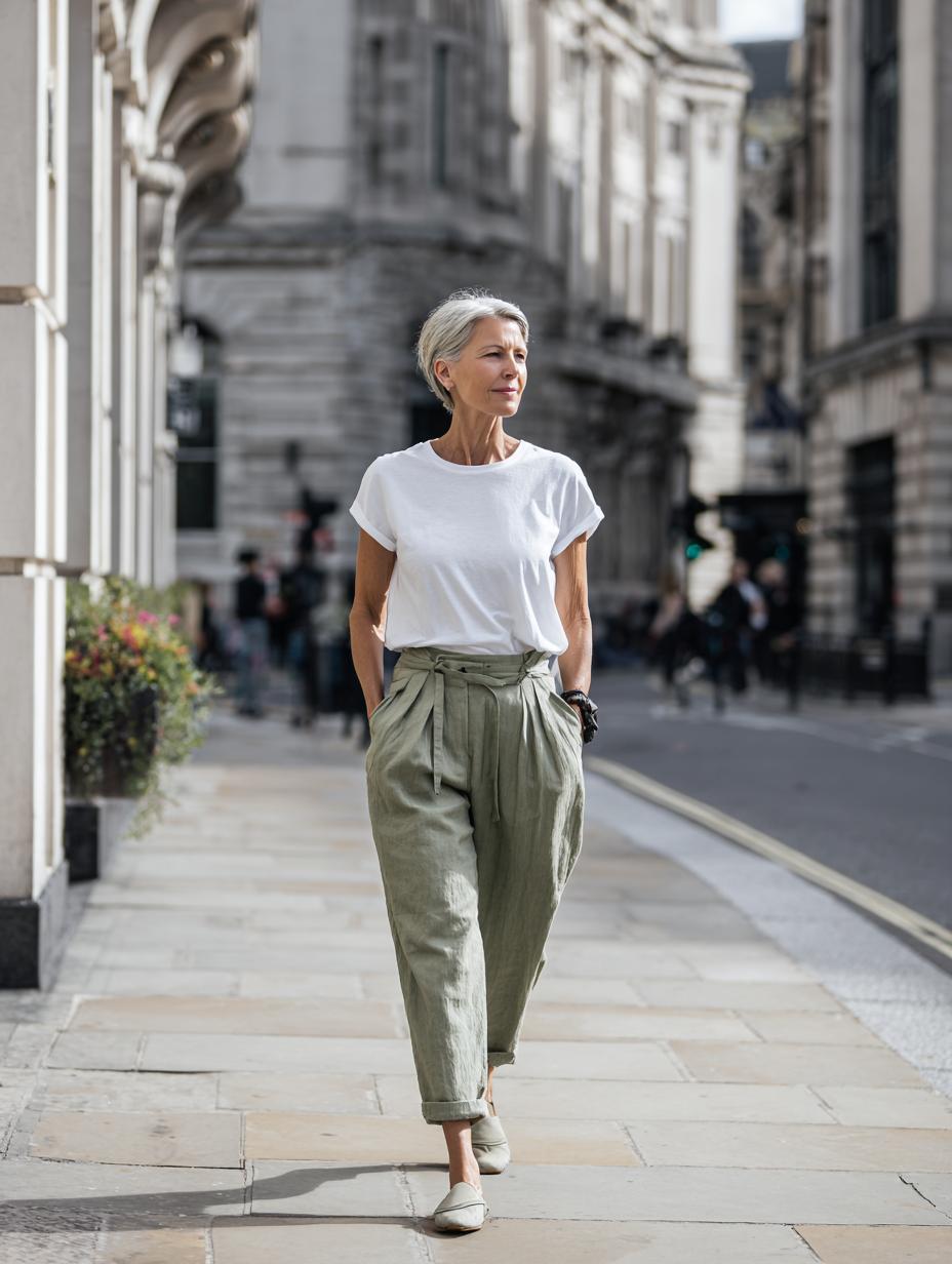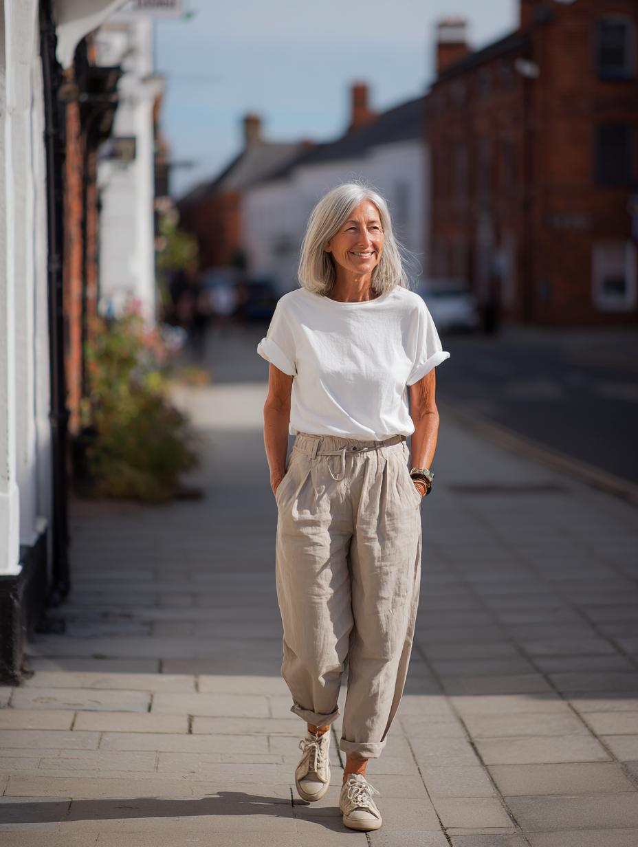 This timeless pairing proves that sophisticated style doesn’t require complexity. The woman’s relaxed yet polished look features a crisp white t-shirt tucked into high-waisted olive linen trousers with a flattering tie-waist detail. Walking confidently through a charming European-style street, she embodies the kind of effortless chic that makes other women stop and take notes. The neutral color palette and natural fabrics create a look that’s both comfortable and camera-ready – perfect for everything from weekend brunches to casual work meetings. Her silver hair adds an extra touch of modern sophistication to this beautifully simple ensemble.