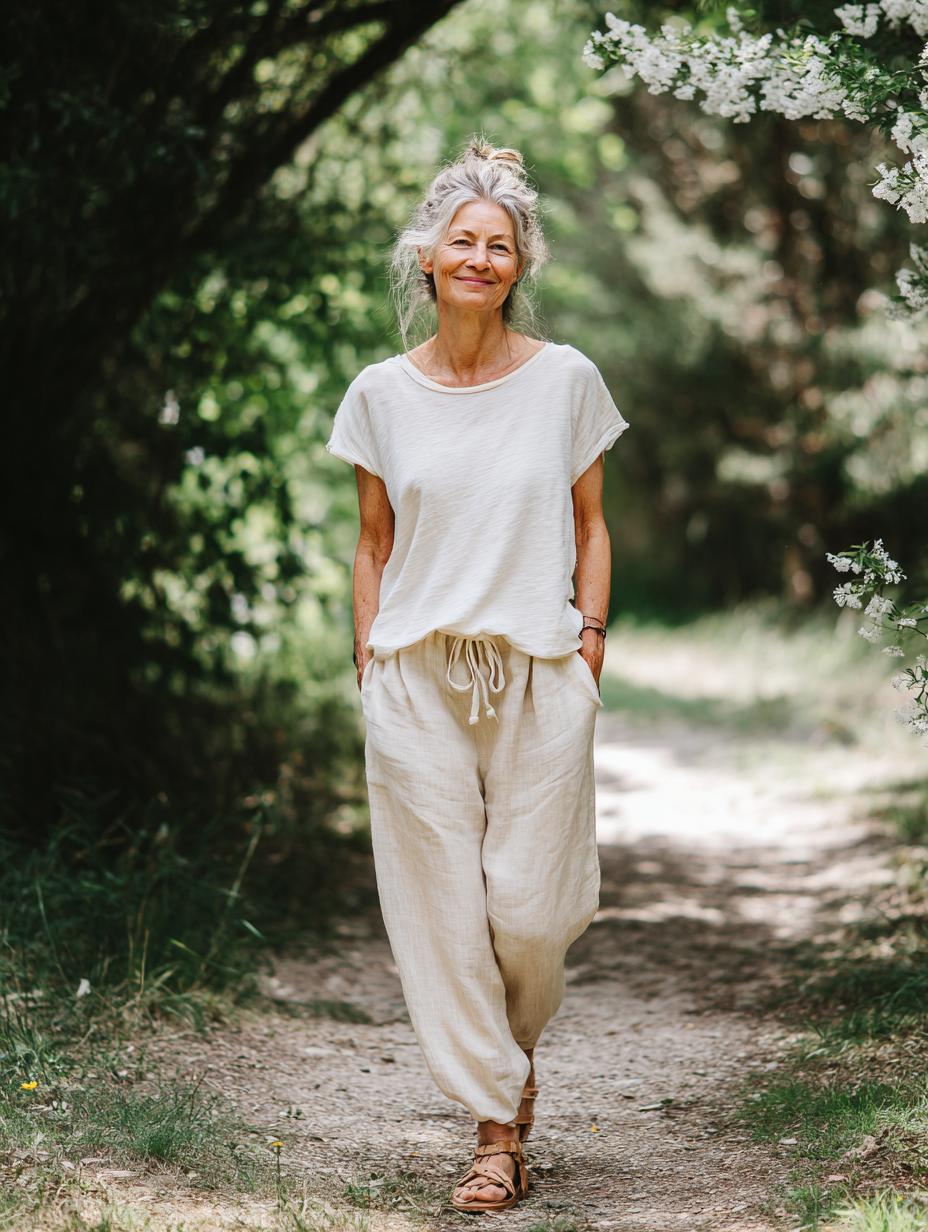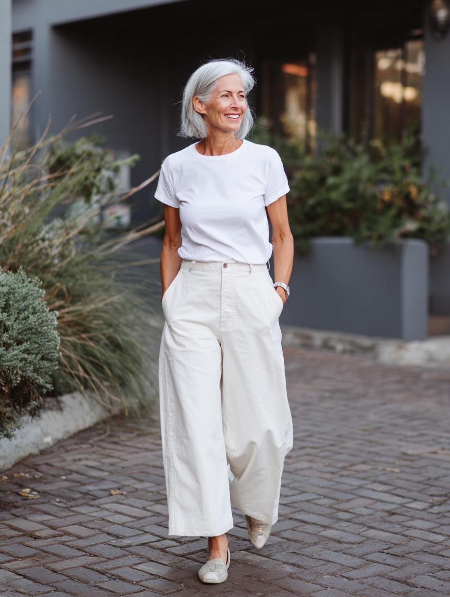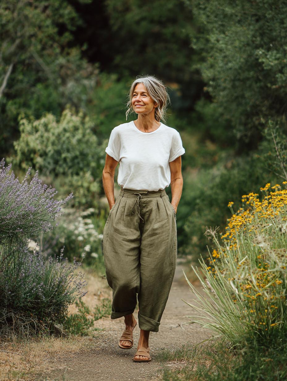 This timeless pairing proves that sophisticated style doesn’t require complexity. The woman’s relaxed yet polished look features a crisp white t-shirt tucked into high-waisted olive linen trousers with a flattering tie-waist detail. Walking confidently through a charming European-style street, she embodies the kind of effortless chic that makes other women stop and take notes. The neutral color palette and natural fabrics create a look that’s both comfortable and camera-ready – perfect for everything from weekend brunches to casual work meetings. Her silver hair adds an extra touch of modern sophistication to this beautifully simple ensemble.
