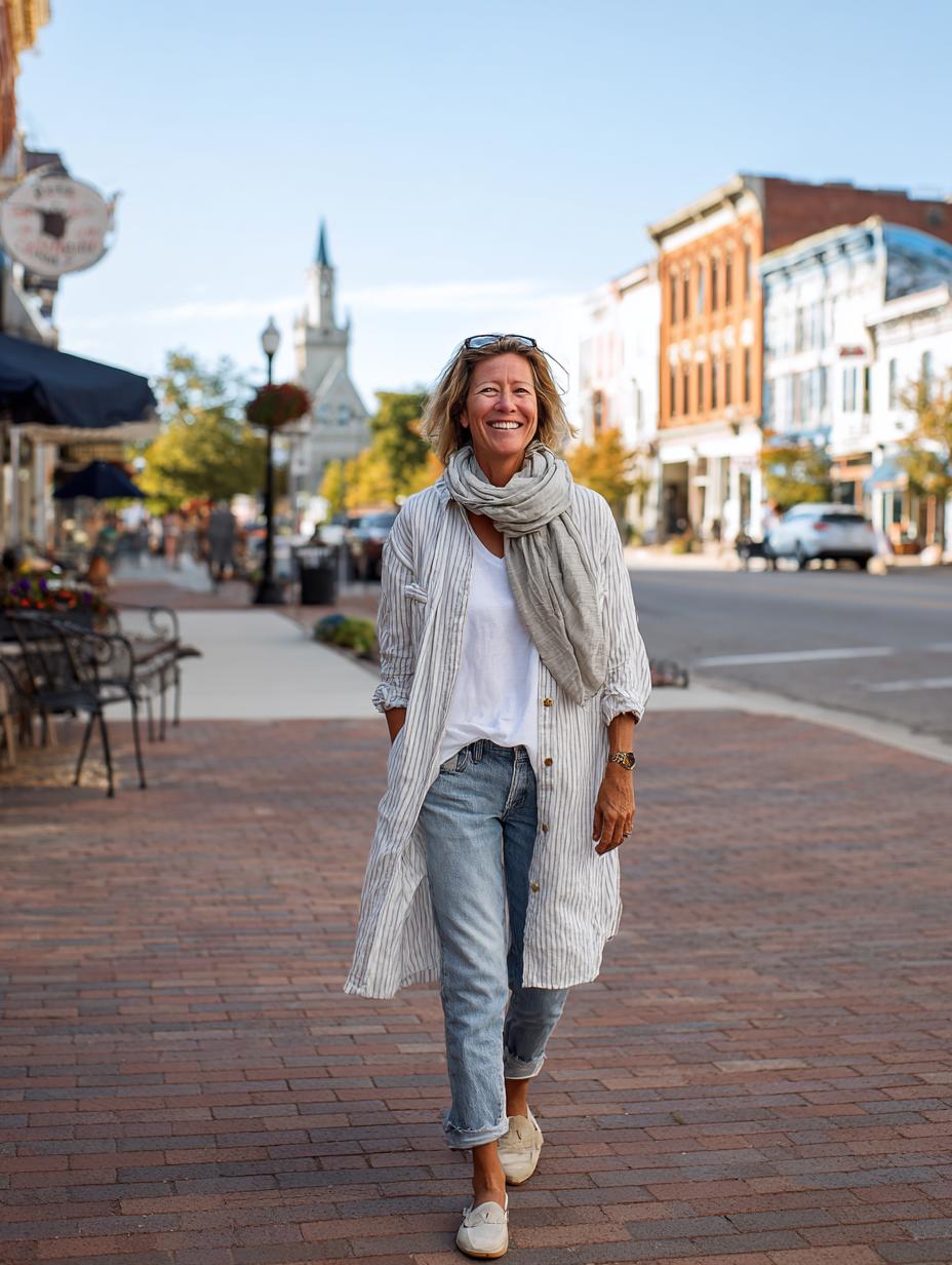 There’s something magical about the way confident women style their white t-shirts – they instinctively know how to elevate the simplest pieces into something extraordinary. This look perfectly captures that natural sophistication with a flowing striped linen duster that creates beautiful movement and visual interest. The relaxed fit jeans and casual sneakers keep things approachable, while the soft scarf adds that thoughtful finishing touch that happy women seem to effortlessly master. It’s the kind of outfit that works equally well for weekend market strolls or casual coffee dates, proving that true style confidence comes from understanding how to layer textures and proportions rather than following rigid fashion rules.