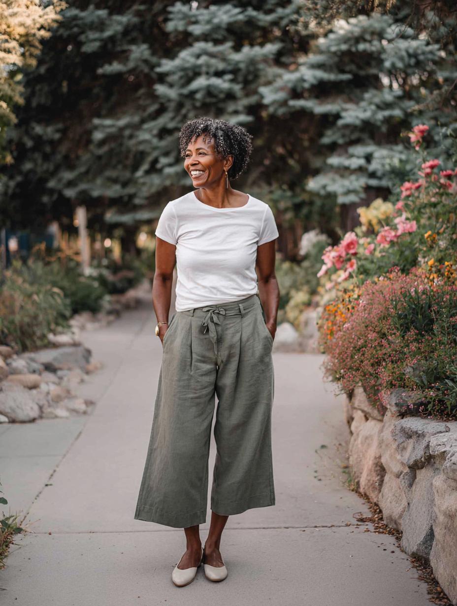 There’s something magical about the combination of a crisp white tee and flowing wide-leg pants that just radiates joy and confidence. This happy woman has mastered the art of relaxed sophistication, pairing her classic white top with sage green culottes that move beautifully as she strolls through a flower-lined pathway. The earthy olive tone of her pants creates a perfect harmony with the garden setting, while her comfortable ballet flats keep the look grounded and walkable. This outfit proves that happiness often comes from the simplest combinations – pieces that make you feel comfortable in your own skin while looking effortlessly put-together. It’s the kind of ensemble that works equally well for weekend farmers market trips, casual lunch dates, or afternoon garden parties.