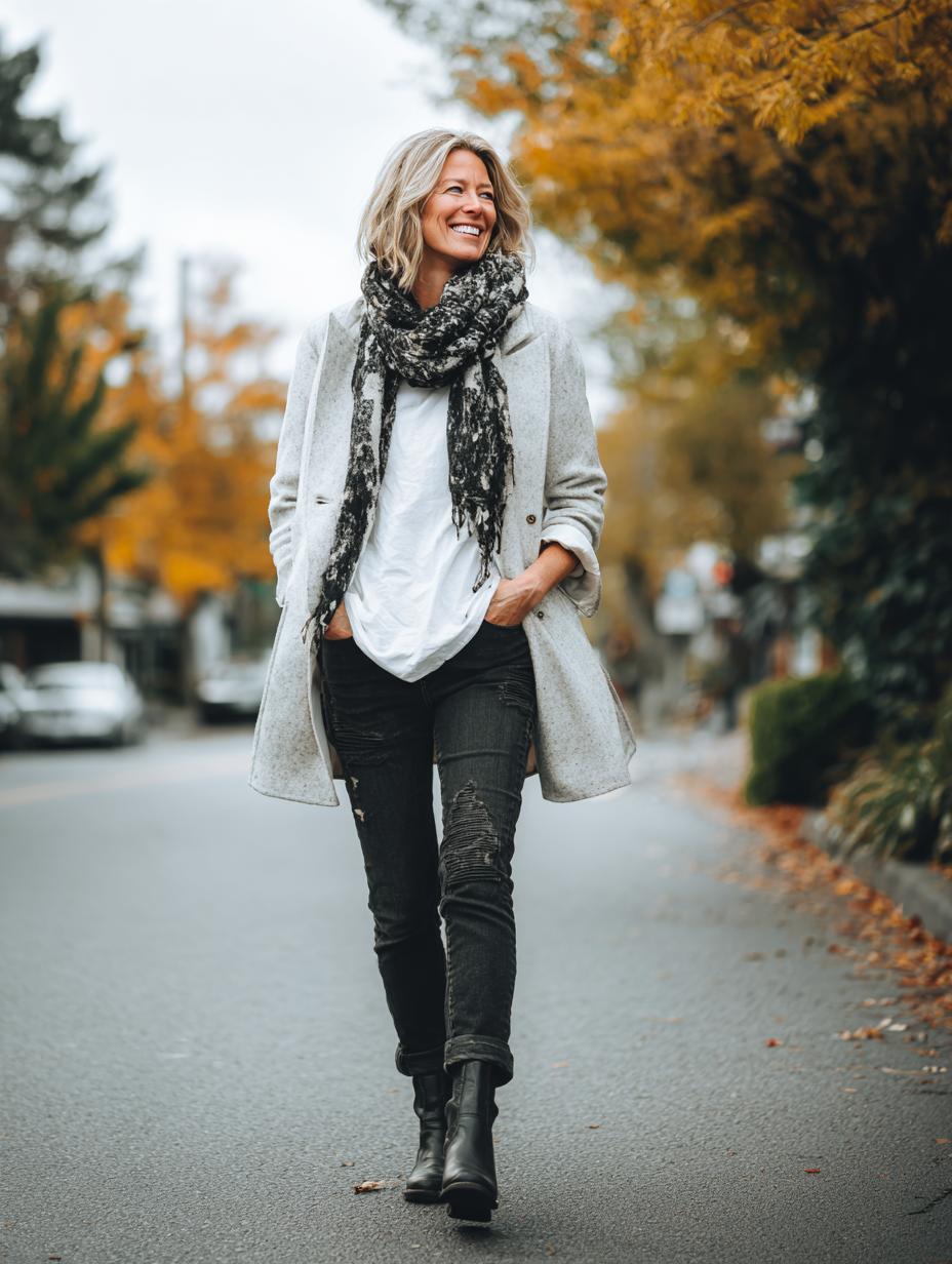This perfectly curated fall ensemble proves that a simple white t-shirt is the ultimate foundation for sophisticated street style. The relaxed layering approach – pairing a classic white tee with a flowing light gray coat and textured scarf – creates an effortlessly chic look that confident women gravitate toward. The distressed dark wash jeans add a touch of edge, while the neutral color palette keeps everything polished and put-together. This outfit demonstrates how happy, stylish women use the white t-shirt as their canvas, building layers that feel both comfortable and intentionally fashionable.