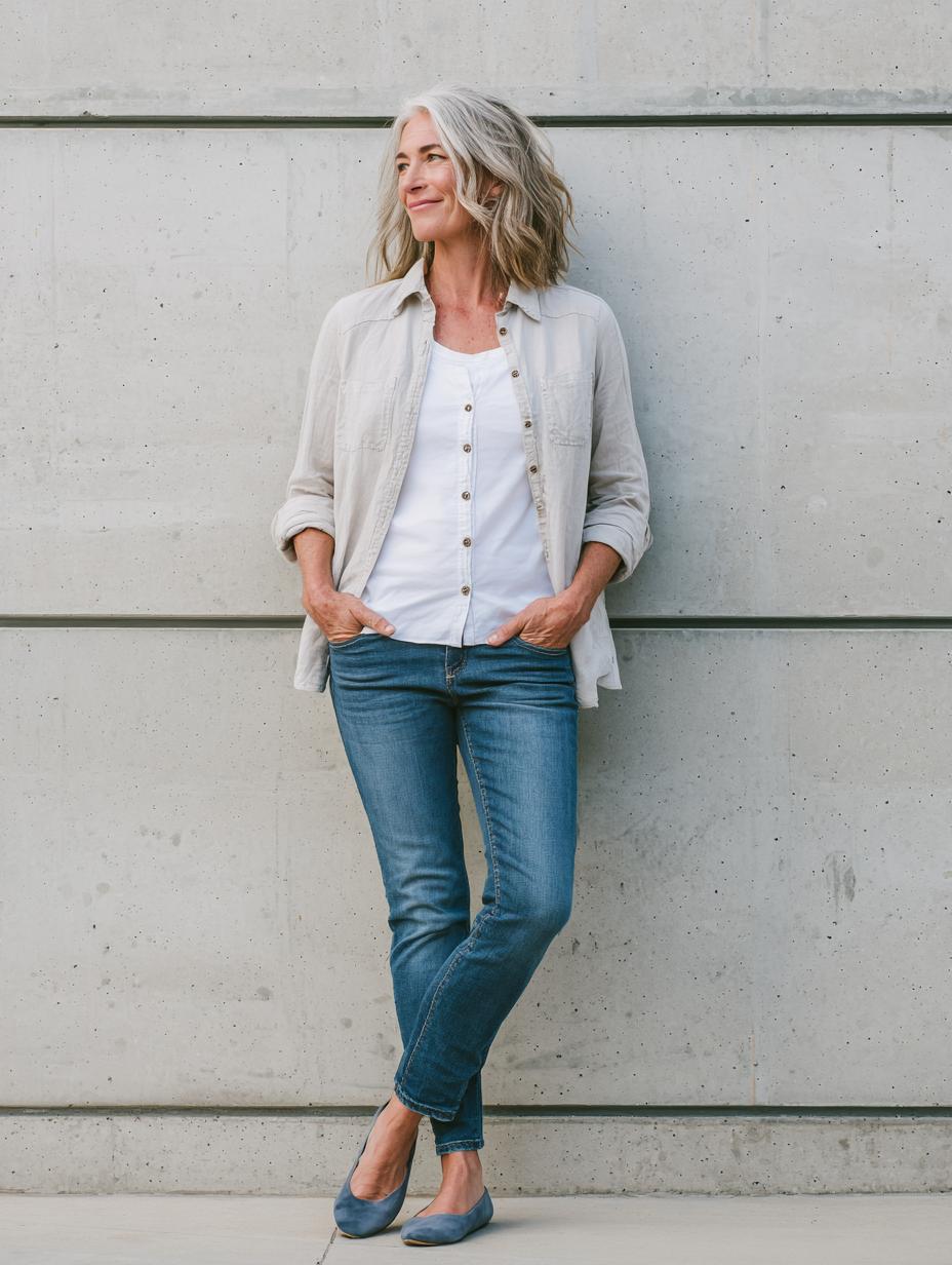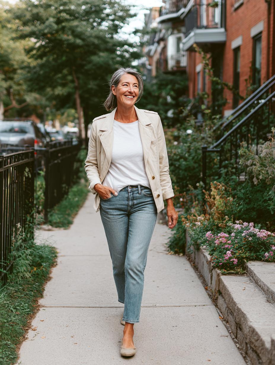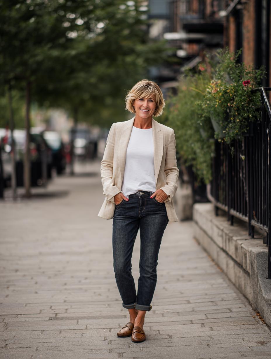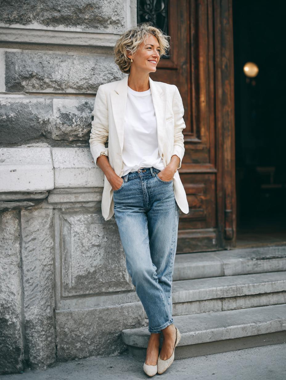 This stunning look proves that the simplest combinations often make the biggest impact. She’s styled a crisp white tee with a structured blazer and relaxed jeans, creating that perfect balance between polished and casual that confident women gravitate toward. The beauty lies in the quality of each piece – the blazer’s clean lines, the jeans’ perfect vintage wash, and those classic neutral flats that ground the entire outfit. It’s the kind of ensemble that works for everything from coffee meetings to weekend gallery visits, embodying that effortless sophistication that never goes out of style.