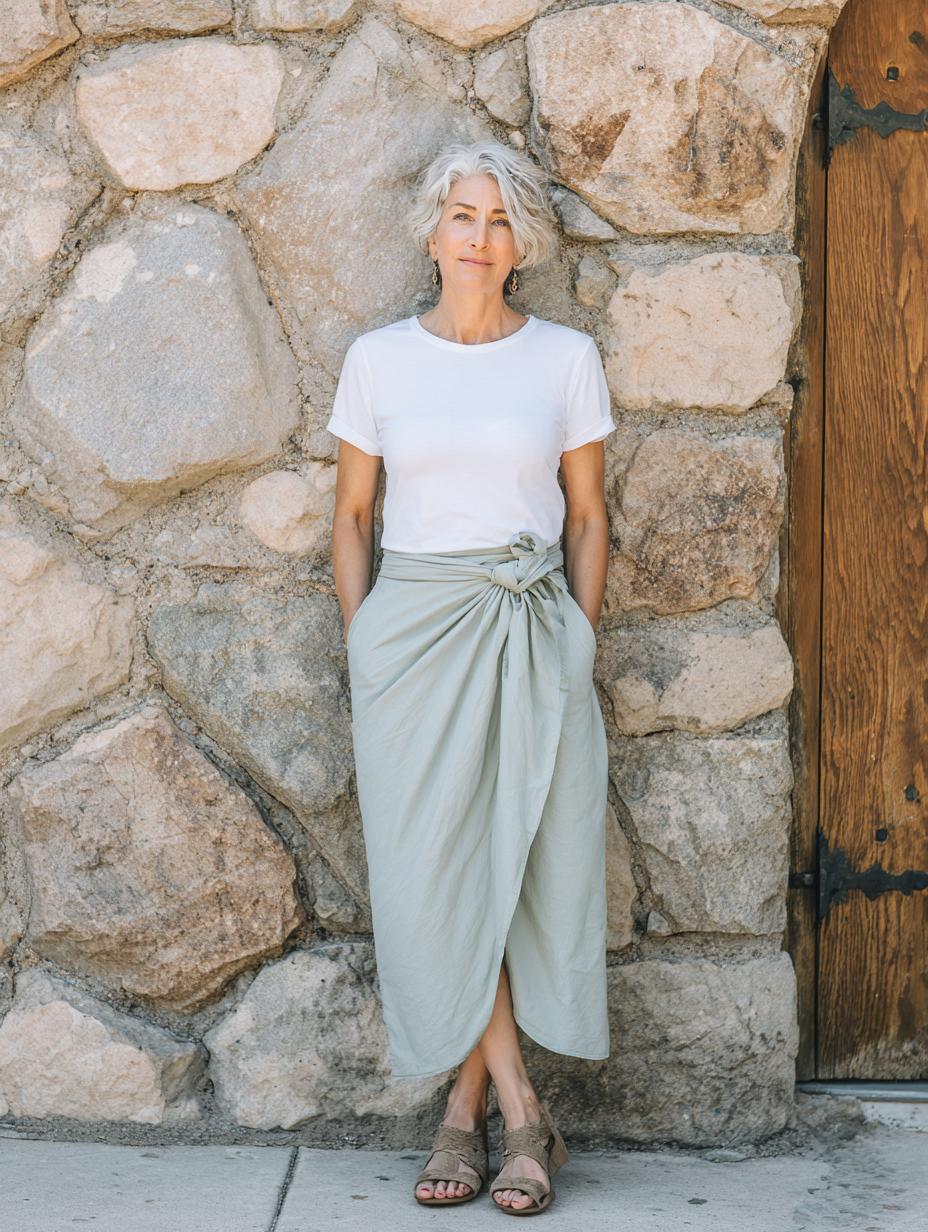 This stunning outfit proves that a simple white t-shirt can be the foundation for truly sophisticated style. The classic white cotton tee is elevated by a gorgeous sage green wrap skirt that creates beautiful draping and movement. The high-low hemline and side tie detail add feminine touches while maintaining an effortless, relaxed vibe. Paired with neutral strappy sandals and set against rustic stone, this look embodies the kind of natural confidence that happy women radiate – comfortable, chic, and completely authentic.