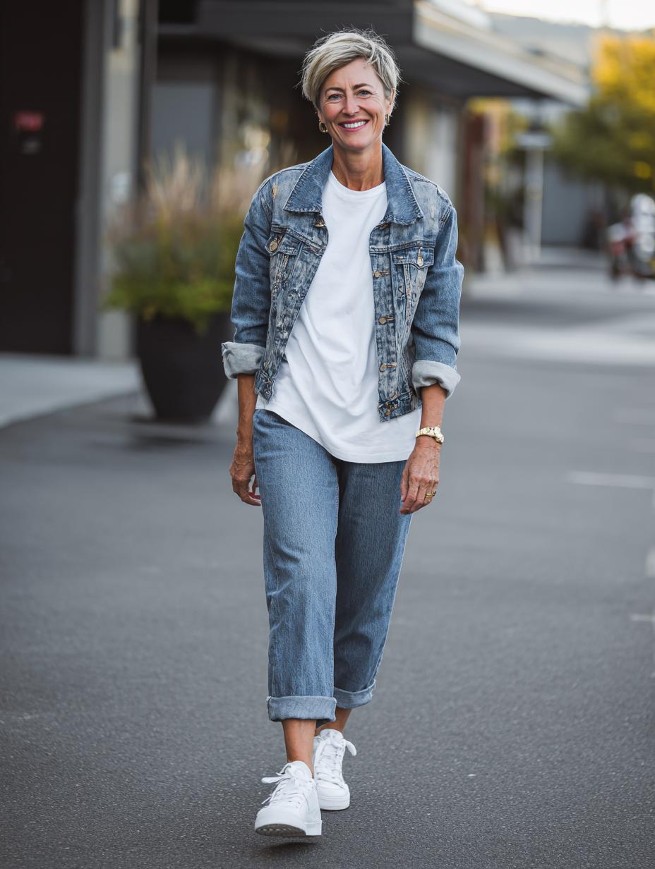 There’s something undeniably confident about a woman who masters the art of casual chic, and this denim-on-denim look perfectly captures that effortless energy. The crisp white t-shirt serves as the perfect neutral foundation, allowing the textured denim pieces to shine without overwhelming the silhouette. The rolled cuffs and relaxed fit create that coveted “borrowed from the boys” aesthetic, while the clean white sneakers keep the whole ensemble feeling fresh and modern. This is proof that sometimes the most impactful outfits are built on timeless basics – it’s a formula that happy, confident women return to again and again because it simply works.