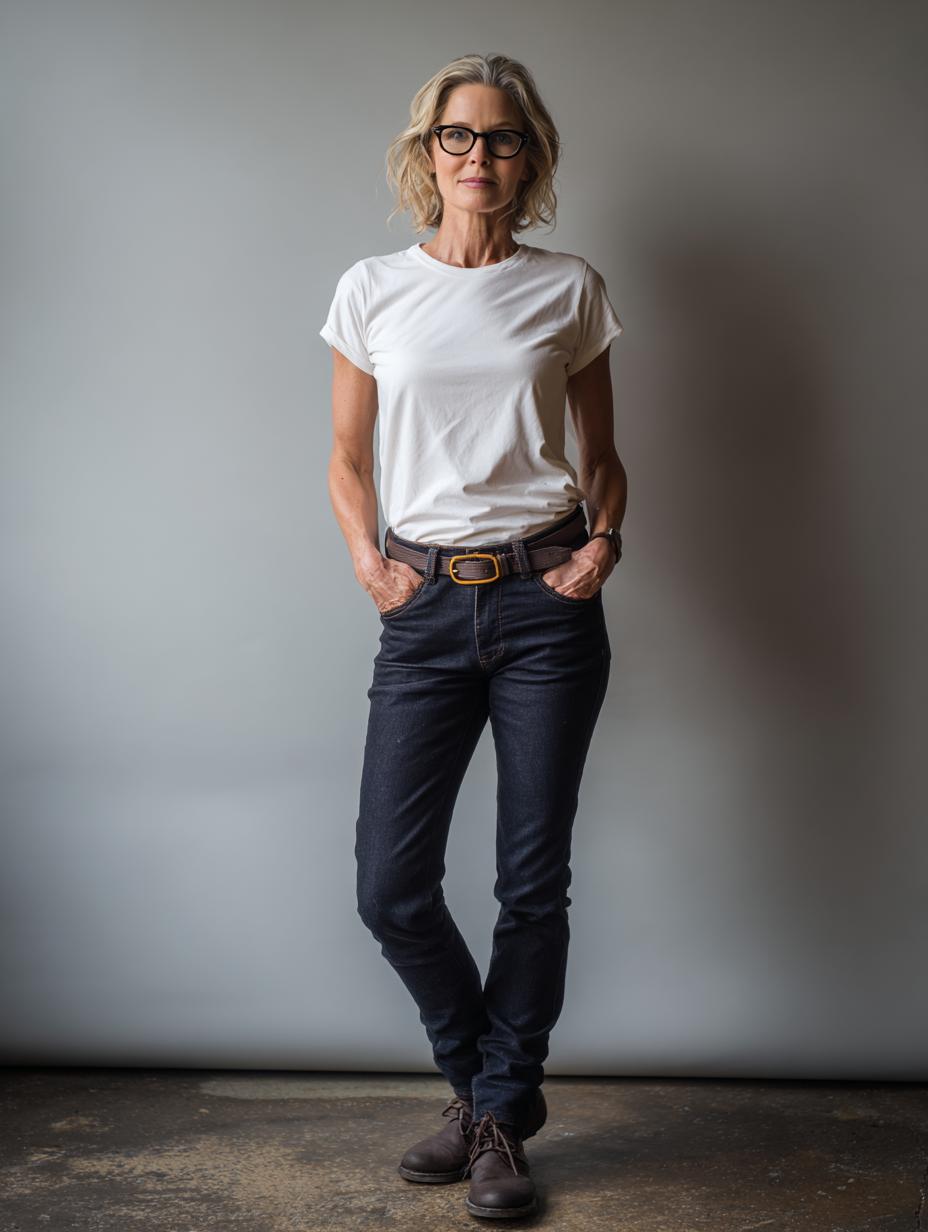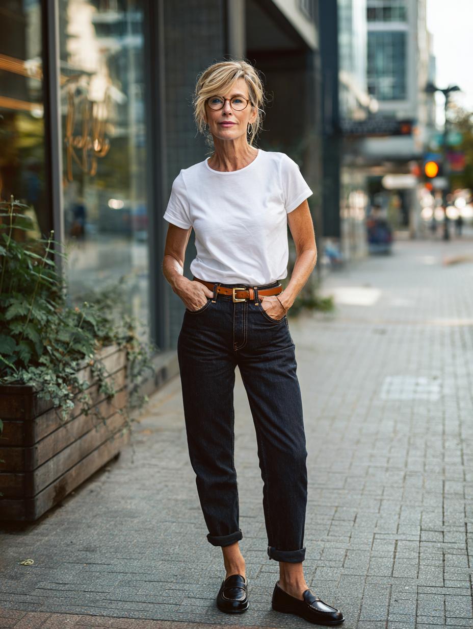 This perfectly curated casual look proves that sometimes the most confident style choices are the simplest ones. The combination of a classic white cotton tee with dark denim creates an effortlessly polished foundation that exudes quiet confidence. The structured accessories – from the sleek eyewear to the timeless leather belt – elevate this everyday ensemble into something truly special. It’s the kind of outfit that makes you feel authentically yourself while looking undeniably put-together, embodying that natural ease that happy, confident women seem to master so effortlessly.