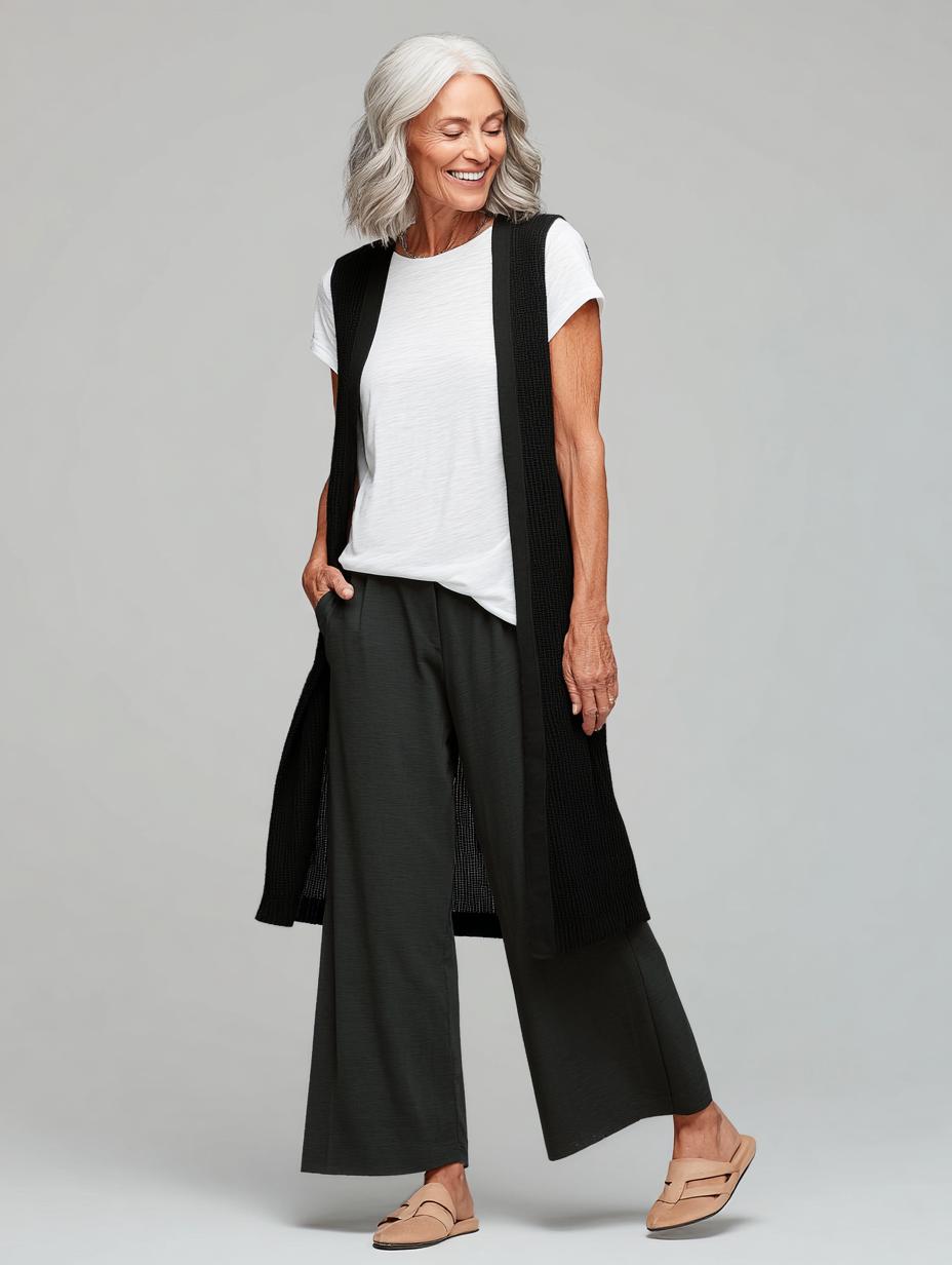 This sophisticated ensemble proves that the secret to elevated casual dressing lies in thoughtful layering and proportions. The crisp white tee serves as the perfect foundation, while the long textured vest adds architectural interest and the wide-leg trousers create a graceful silhouette. The monochromatic forest green palette feels fresh and modern, while the relaxed fit ensures all-day comfort. This formula works beautifully for everything from coffee dates to casual Fridays, showing how three simple pieces can create maximum style impact.