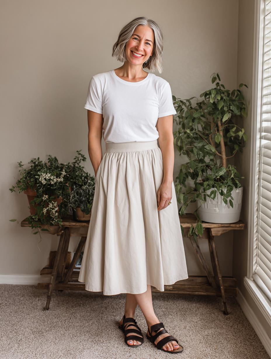 Effortless Elegance: The White Tee and Flowing Skirt Combination That Radiates Joy