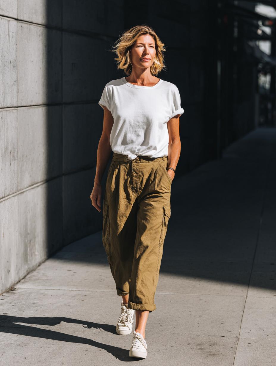 Effortless Urban Chic: The Perfect White Tee and Cargo Pant Combination