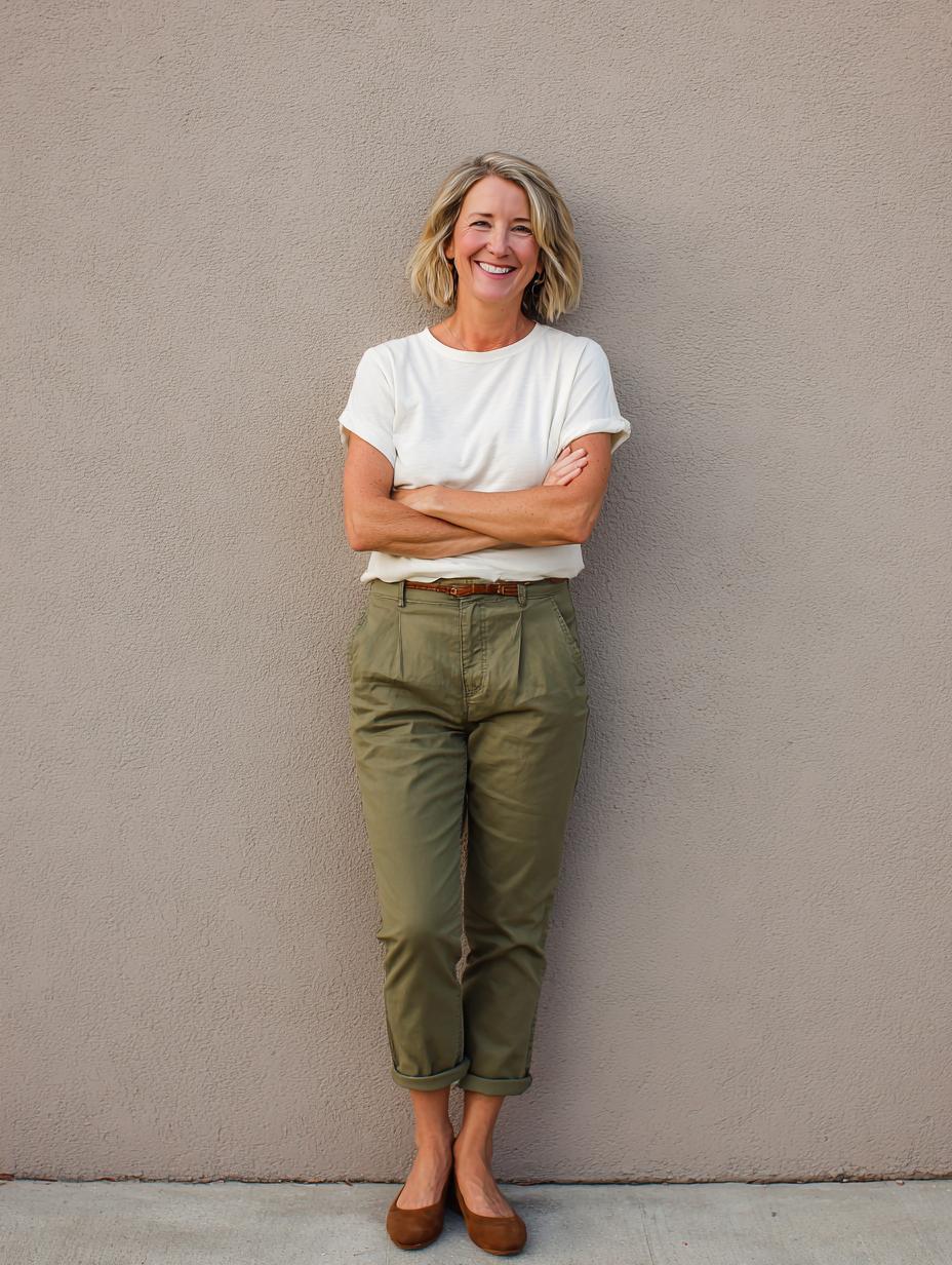 This timeless outfit proves that happiness comes from mastering the basics with style. The crisp white t-shirt paired with perfectly tailored olive green chinos creates an effortlessly polished look that’s both comfortable and put-together. The rich brown leather belt adds a sophisticated touch, while the warm cognac flats ground the ensemble beautifully. This is the kind of outfit that makes you feel confident and ready for anything – from casual coffee dates to weekend errands. The relaxed yet refined silhouette flatters every body type and exudes that natural confidence that truly happy women possess.