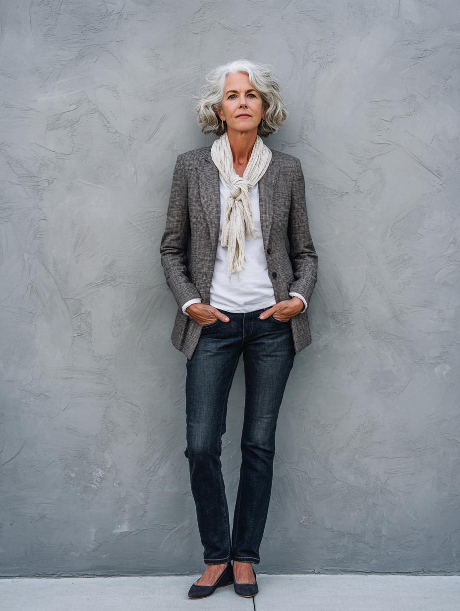 This timeless outfit proves that the simplest combinations often make the strongest style statements. A crisp white t-shirt serves as the perfect foundation for a structured gray blazer, while dark wash jeans keep the look grounded and approachable. The addition of a cream textured scarf elevates this everyday ensemble from basic to effortlessly sophisticated. This is the kind of outfit that confident women reach for when they want to look polished without trying too hard – perfect for coffee dates, casual meetings, or weekend errands when you want to feel put-together.