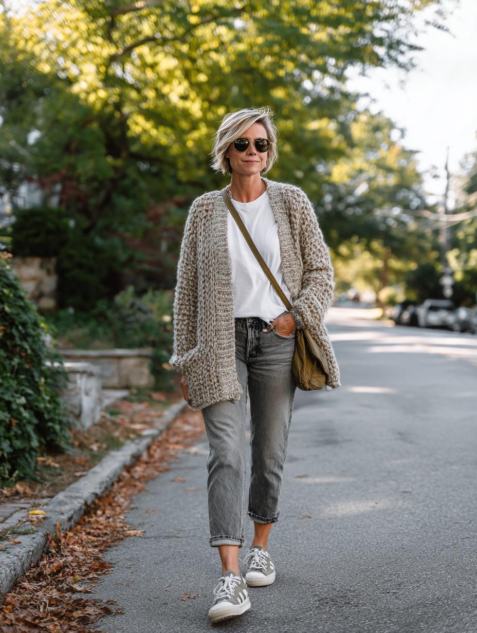 This perfectly balanced outfit proves that a simple white tee can be the foundation for sophisticated street style. The oversized knit cardigan adds texture and warmth while maintaining that relaxed, confident vibe that radiates pure contentment. Paired with perfectly worn denim and casual sneakers, this look captures the essence of a woman who’s found her style sweet spot – comfortable enough for daily adventures yet polished enough to feel put-together wherever the day takes her.