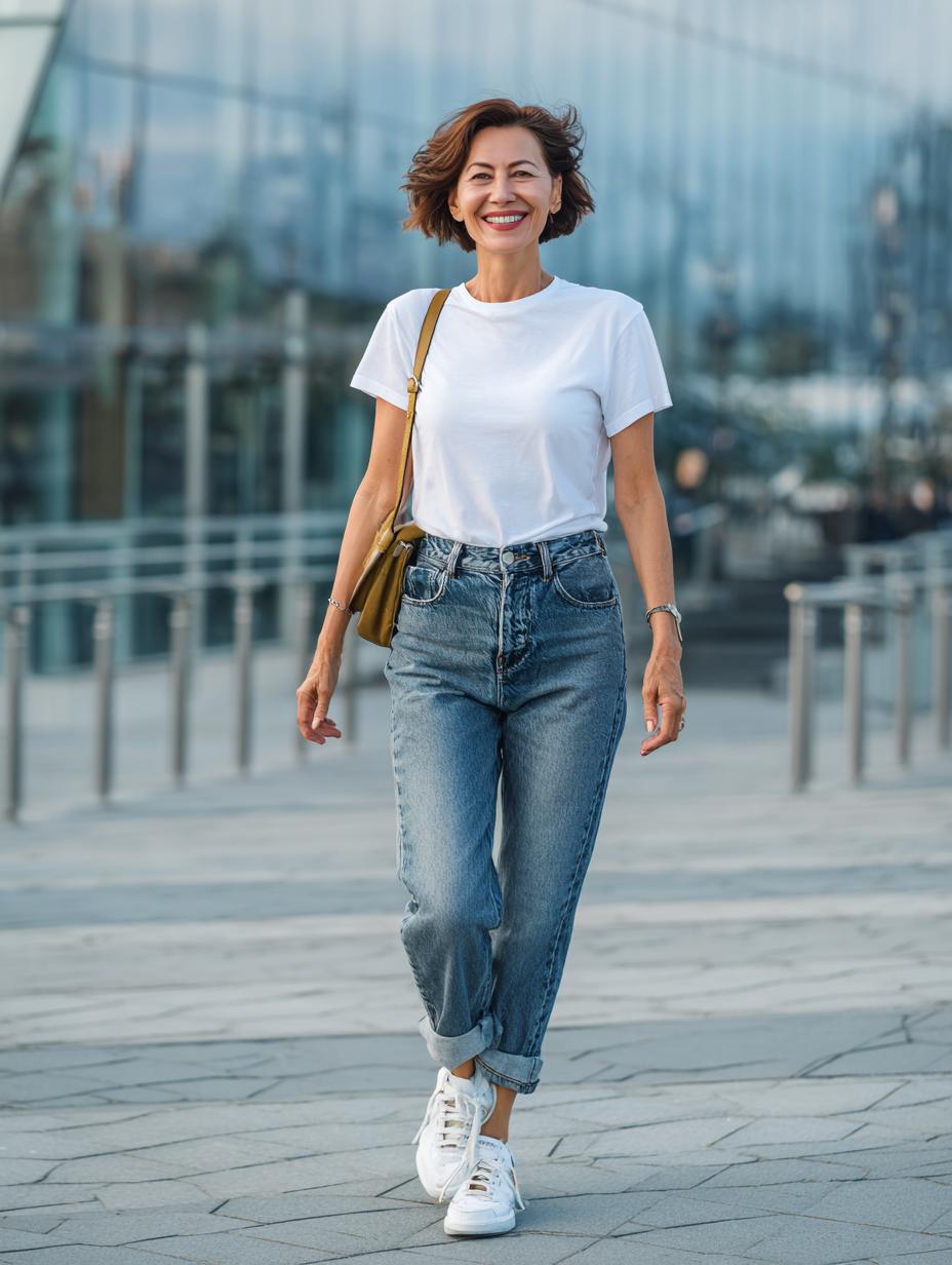 Sometimes the most joyful outfits are the simplest ones. This radiant woman embodies pure happiness in a timeless combination that proves you don’t need complicated pieces to look absolutely stunning. Her relaxed white cotton tee paired with perfectly fitted denim creates an effortlessly chic look that’s both comfortable and polished. The key to nailing this classic combo lies in the fit and styling – notice how the tee is casually tucked, the jeans are cuffed just right, and the whole ensemble feels perfectly balanced. This is the kind of outfit that makes you feel confident and carefree, whether you’re running errands, meeting friends for coffee, or taking a leisurely stroll through your neighborhood. It’s a reminder that true style comes from feeling comfortable in your own skin.