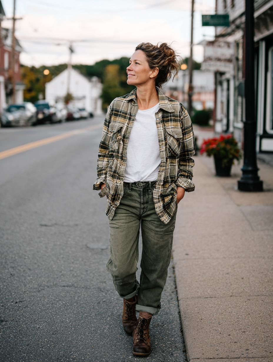 There’s something so naturally chic about a woman who can throw on a classic white tee and make it look effortlessly put-together. This look captures that perfect balance between comfort and style – a crisp white cotton tee layered under an oversized plaid flannel, paired with relaxed-fit olive green jeans and sturdy boots. Her hair is casually swept up in a messy bun, and she’s walking down a charming small-town street with the kind of confidence that comes from knowing you look great without trying too hard. It’s the kind of outfit that works for everything from weekend farmers market trips to casual coffee dates, proving that the best white tee outfits are the ones that make you feel authentically yourself.