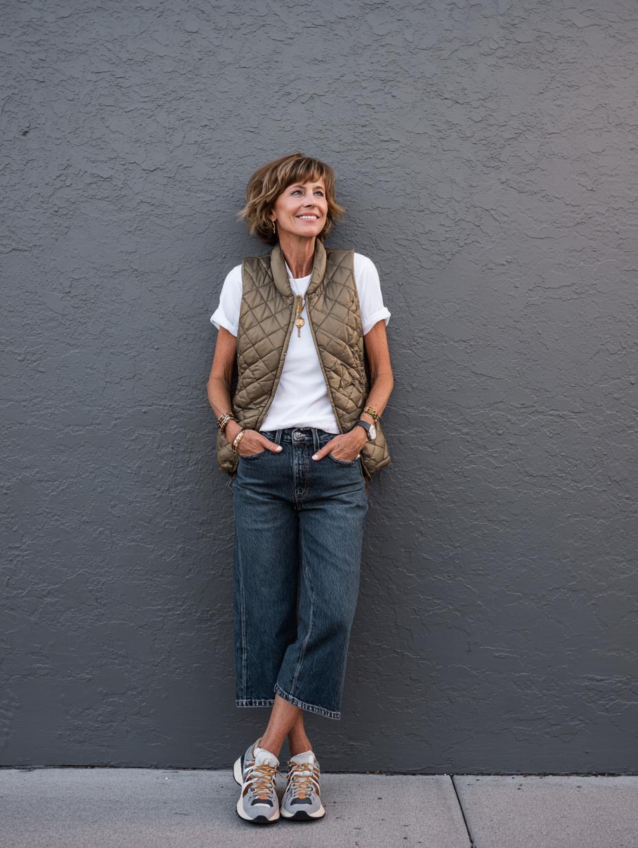 There’s something so naturally confident about a woman who masters the art of elevated casual dressing. This look perfectly captures that happy, put-together energy that comes from choosing pieces that feel as good as they look. The combination of a crisp white tee with a structured quilted vest creates instant sophistication while maintaining that approachable, real-woman appeal. The rolled cuffs on those perfectly faded jeans add a touch of intentional styling that shows she cares about the details without trying too hard. This is the kind of outfit that transitions seamlessly from coffee runs to casual Friday meetings, proving that the best style choices are often the most effortless ones.