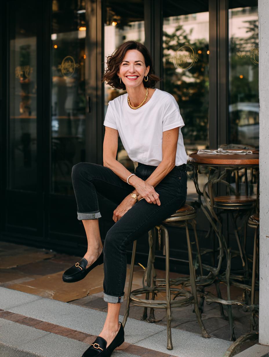 This sophisticated street style look proves that the simplest combinations often make the strongest statements. Our confident woman showcases how a crisp white t-shirt paired with high-waisted dark wash jeans creates an instantly polished yet approachable ensemble. The addition of classic leather loafers and smart eyewear elevates this casual foundation into a versatile outfit perfect for everything from coffee meetings to weekend shopping. Her relaxed posture and genuine smile demonstrate the comfort and confidence that comes from mastering timeless wardrobe staples. This is the kind of outfit that happy, busy women reach for again and again – it’s effortless, flattering, and always appropriate.