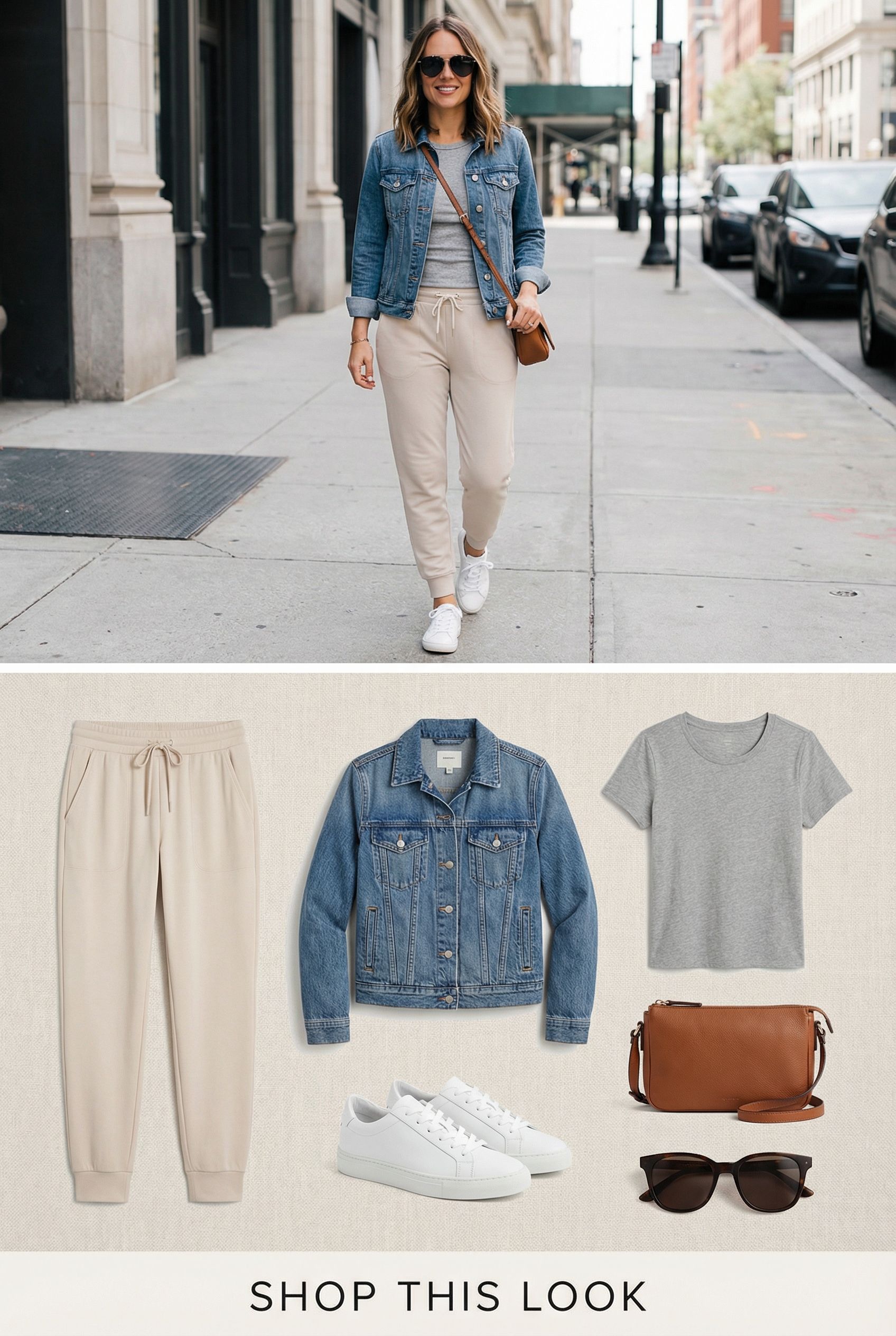 This effortlessly stylish weekend look blends comfort and polish in a way that feels perfect for women over 40. The soft joggers and simple tee keep things relaxed, while the denim jacket, clean white sneakers, and structured crossbody elevate the entire outfit. It’s the kind of everyday uniform that looks put-together without trying—easy to wear, easy to copy, and easy to love. Shop this look below.