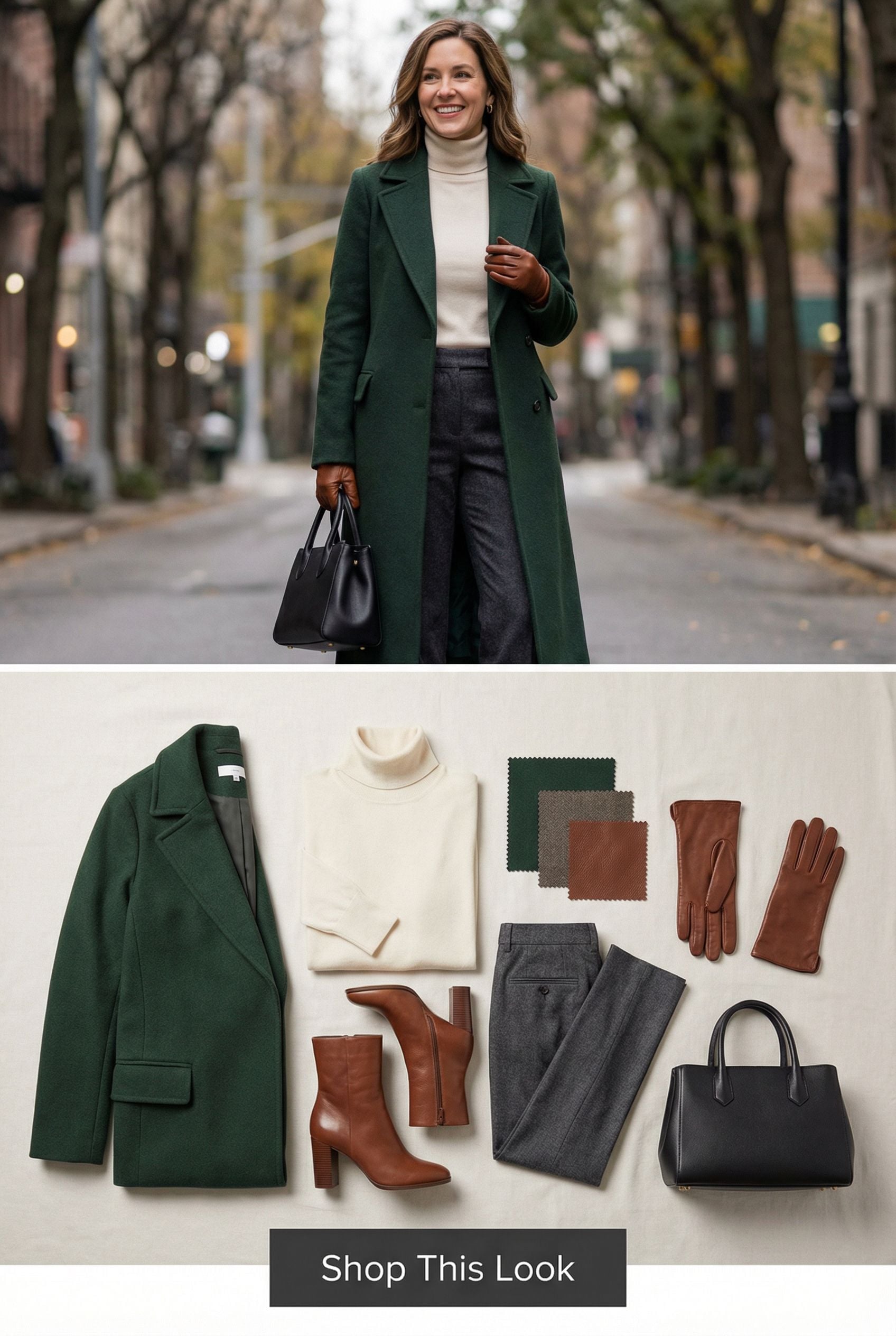 This elegant winter look is the definition of timeless—rich textures, warm tones, and polished layers that feel effortlessly refined. The deep green coat pairs beautifully with the cream turtleneck and tailored charcoal trousers, creating a look that stands out without shouting. With structured accessories and sleek leather boots, it’s the perfect cold-weather uniform for women over 40 who want style and confidence in every step. Shop this look below.