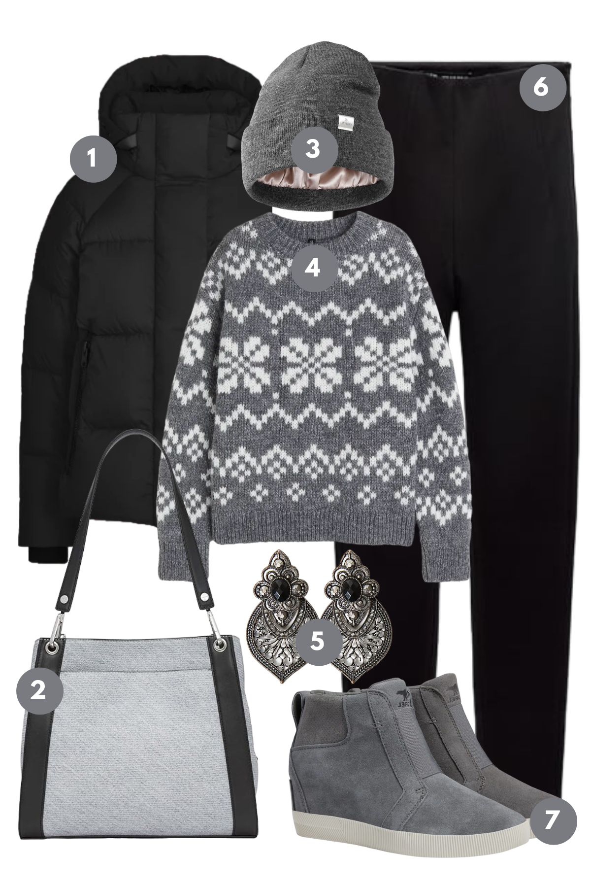 Step into the winter season with style and warmth with this elegantly curated ensemble, designed for those who appreciate a touch of classic charm with their comfort. The moodboard presents a timeless winter palette, featuring a cozy grey knitted sweater adorned with a traditional snowflake pattern that promises to keep you snug. Paired with a plush black puffer jacket, it’s an outfit that wraps you in warmth. A chic, two-tone grey shoulder bag adds a dash of practical sophistication to carry your essentials. For a little dramatic flair, ornate black earrings create a statement while maintaining an air of classic elegance.