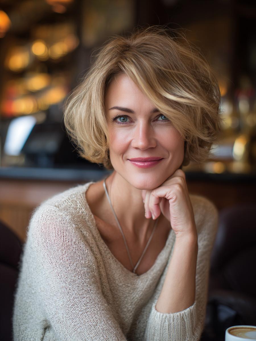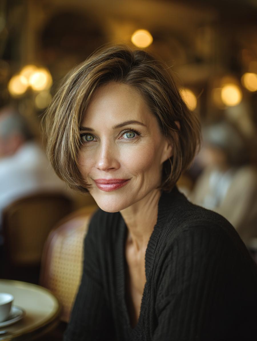This sophisticated look pairs a beautifully textured honey-blonde bob with subtle lowlights that catch the warm café lighting, creating dimension and movement with every turn of the head. The deep charcoal knit cardigan drapes elegantly with its ribbed texture, offering a cozy yet polished contrast to the expertly styled hair that appears effortlessly tousled but undeniably chic. The overall vibe is understated luxury—the kind of refined, lived-in beauty that makes “age-appropriate” feel like an outdated concept.