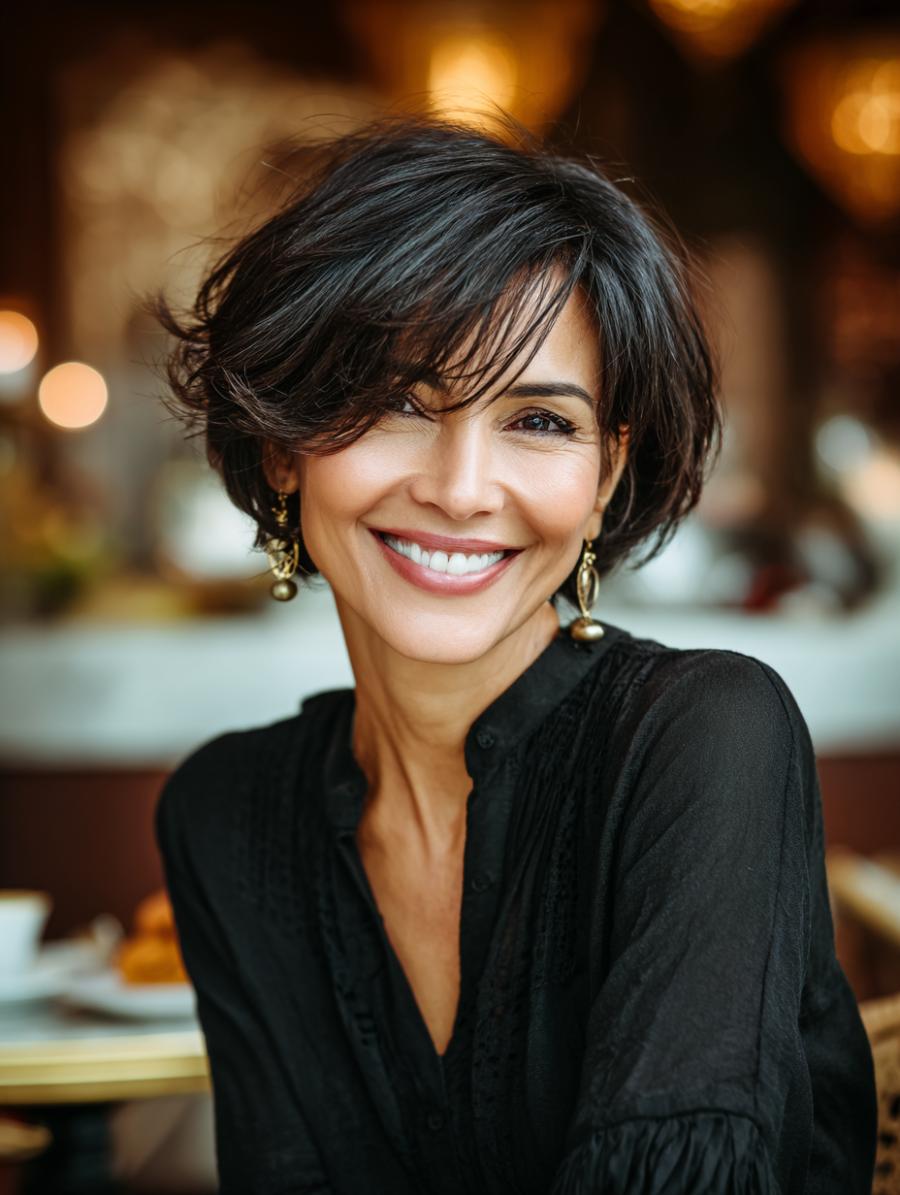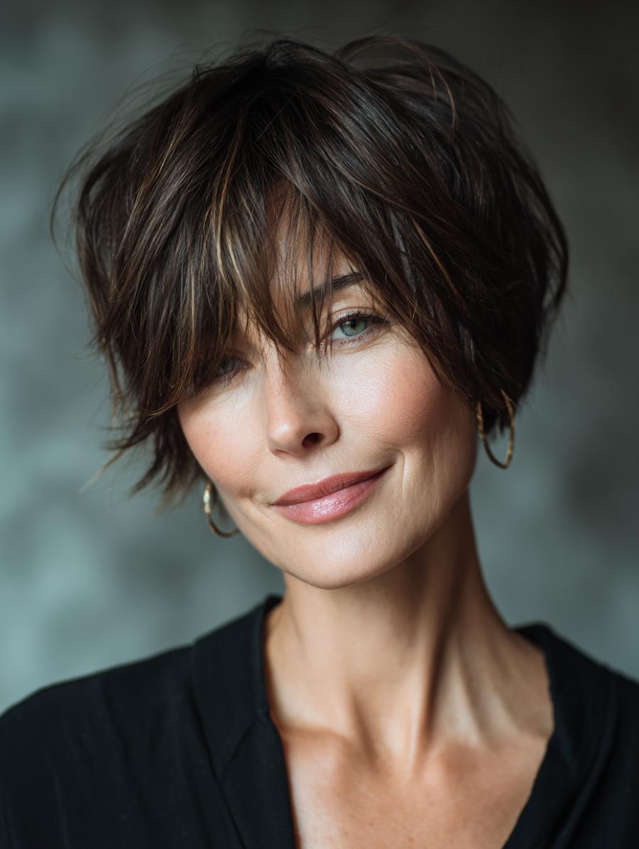 This perfectly imperfect short cut features rich chocolate brown strands with golden highlights that catch the light beautifully, styled with an intentionally messy, just-rolled-out-of-bed texture. Paired with a classic black top and delicate gold hoop earrings, the look radiates confident sophistication with a rebellious edge. The piecey, face-framing layers and tousled finish prove that the most striking hairstyles are often the ones that look like you didn’t try too hard.